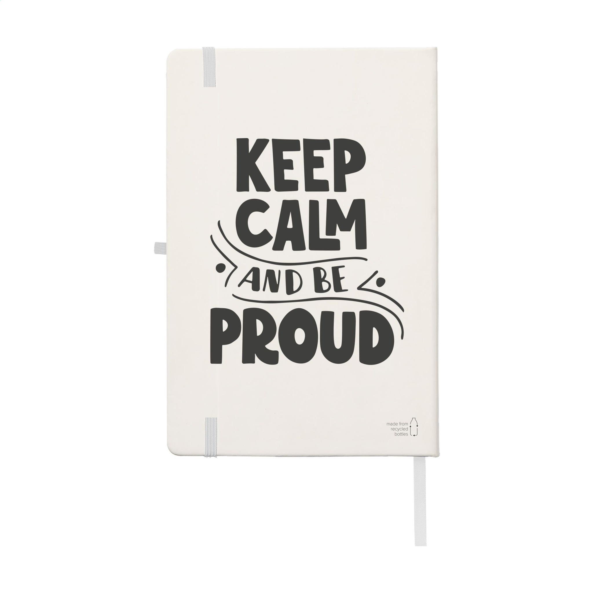 WoW! Practical notebook in A5 format. With hard RPET cover (made from PET bottles) and approx. 80 sheets/160 sheets of cream coloured, lined paper (70 g/m²). With handy elastic closure, reading ribbon and pen loop.