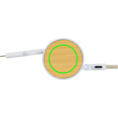 Compact and easy to carry retractable multi cable made with certified recycled materials. Comes with 5 different connectors: USB C in, USB A in, type C out, IOS out and micro USB out. This also allows you to use the cable with type C output devices that are included in the newer generation of phones and macbook computers. The cable also has a USB A output input option so it can charge any device from any output source. Casing made from FSC bamboo and RCS certified recycled ABS, cables made from RCS certified recycled TPE material. Total recycled content: 63% based on total item weight. Max cable length: 100 cm. Packed in FSC mixed kraft sleeve packaging. RCS certification ensures a complete certified supply chain of the recycled material. PVC free.
