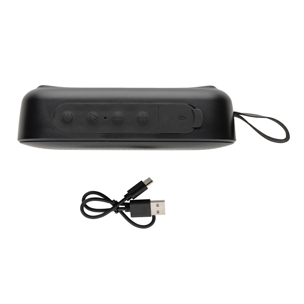 5W wireless speaker made with RCS (Recycled Claim Standard) certified recycled ABS. Total recycled content: 36% based on total item weight. RCS certification ensures a completely certified supply chain of the recycled materials. The speaker is equipped with a 1200 mAh battery to ensure up to 6 hours of playing time and BT5.3 for smooth connection with clear sound. Connection range up to 10 metres. With mic to answer calls. Packed in FSC® mix box. Including RCS certified recycled TPE charging cable. Item and accessories 100% PVC free. IPX 5 waterproof.