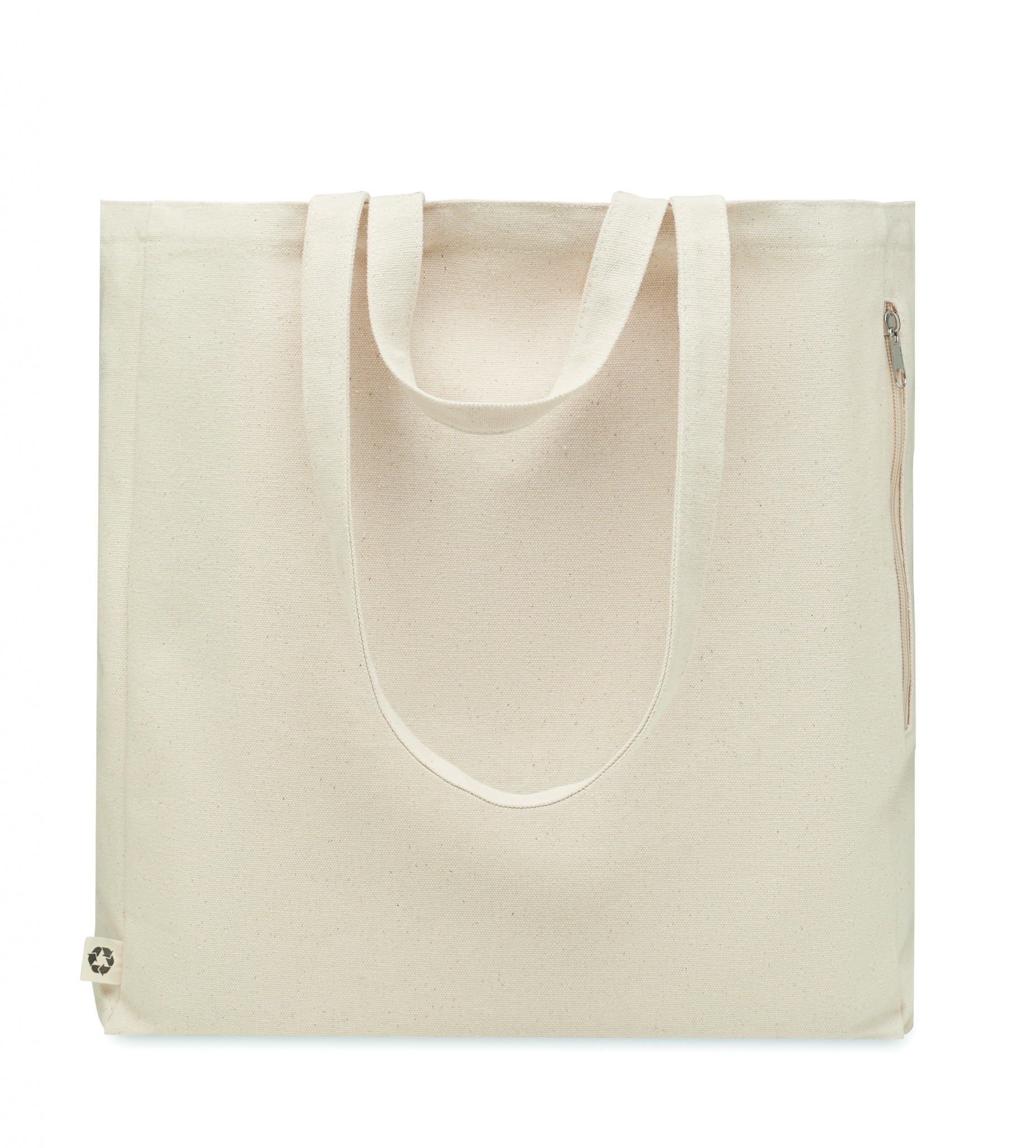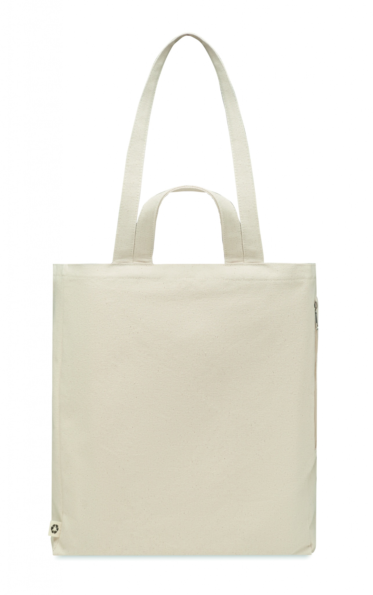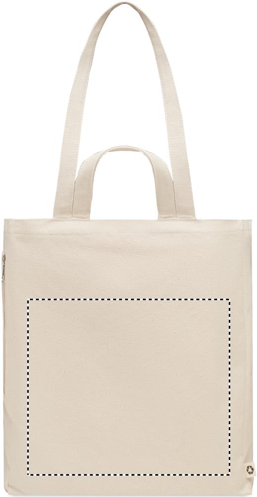 Recycled polycotton shopping or beach bag (70% recycled cotton, 30% recycled polyester) with short handles. It has a side zippered pocket. 380 gr/m².