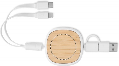 Multi-USB retractable charging cable in ABS with bamboo detail top. Input: 2-in-1 Type-C and Type-A. Output: Type-C and 2-in-1 micro-B connector. Cable length: 90 cm.