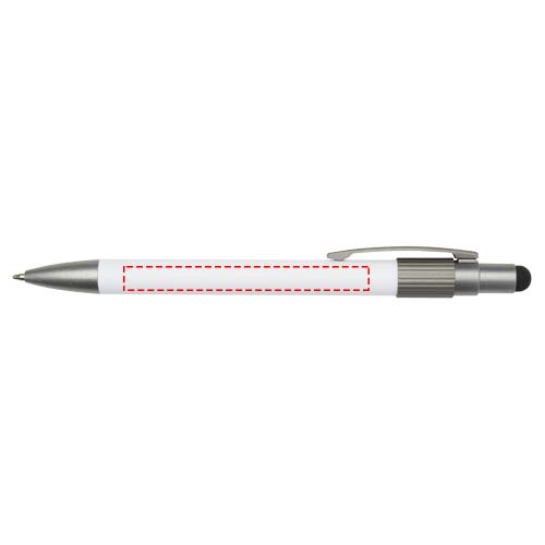 Ballpoint pen with stylus and fidget spinner, combining practicality with a playful design. The pen is made from RCS certified recycled aluminium and features a smooth push mechanism and a stylus tip for touchscreen use. A built-in fidget spinner on top adds a stress-relieving touch (just flick to activate). Pen ink colour: black. Writing length: 1000 metres.