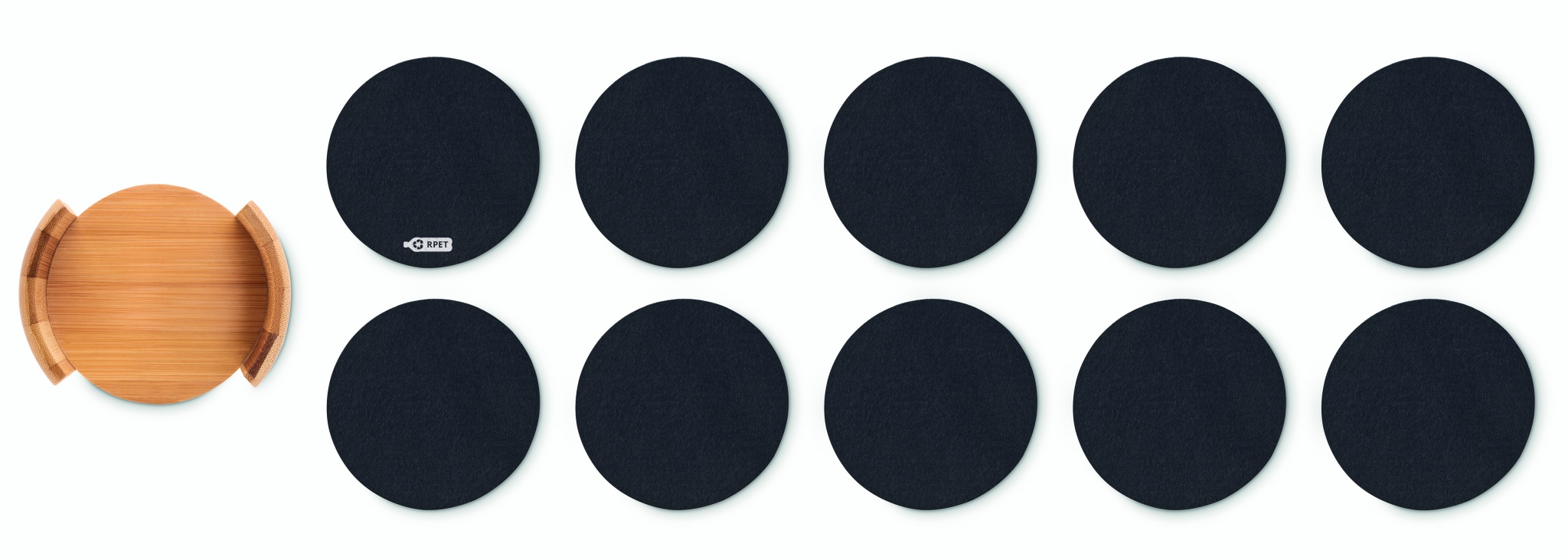 Set of 10 coasters made in RPET felt presented in a bamboo holder. Bamboo is a natural product, there may be slight variations in colour and size per item, which can affect the final decoration outcome.
