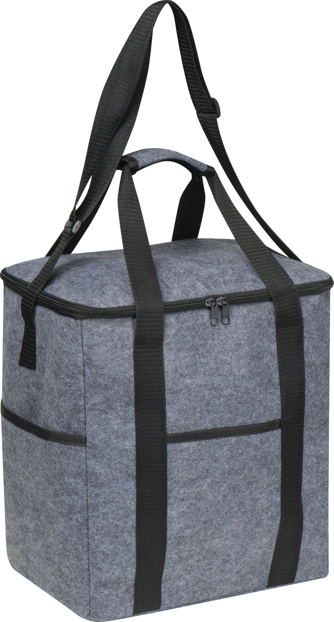 Extra-large cooler bag made from recycled felt. It features a large main compartment, three external slip pockets, two carrying handles, and an adjustable shoulder strap.
