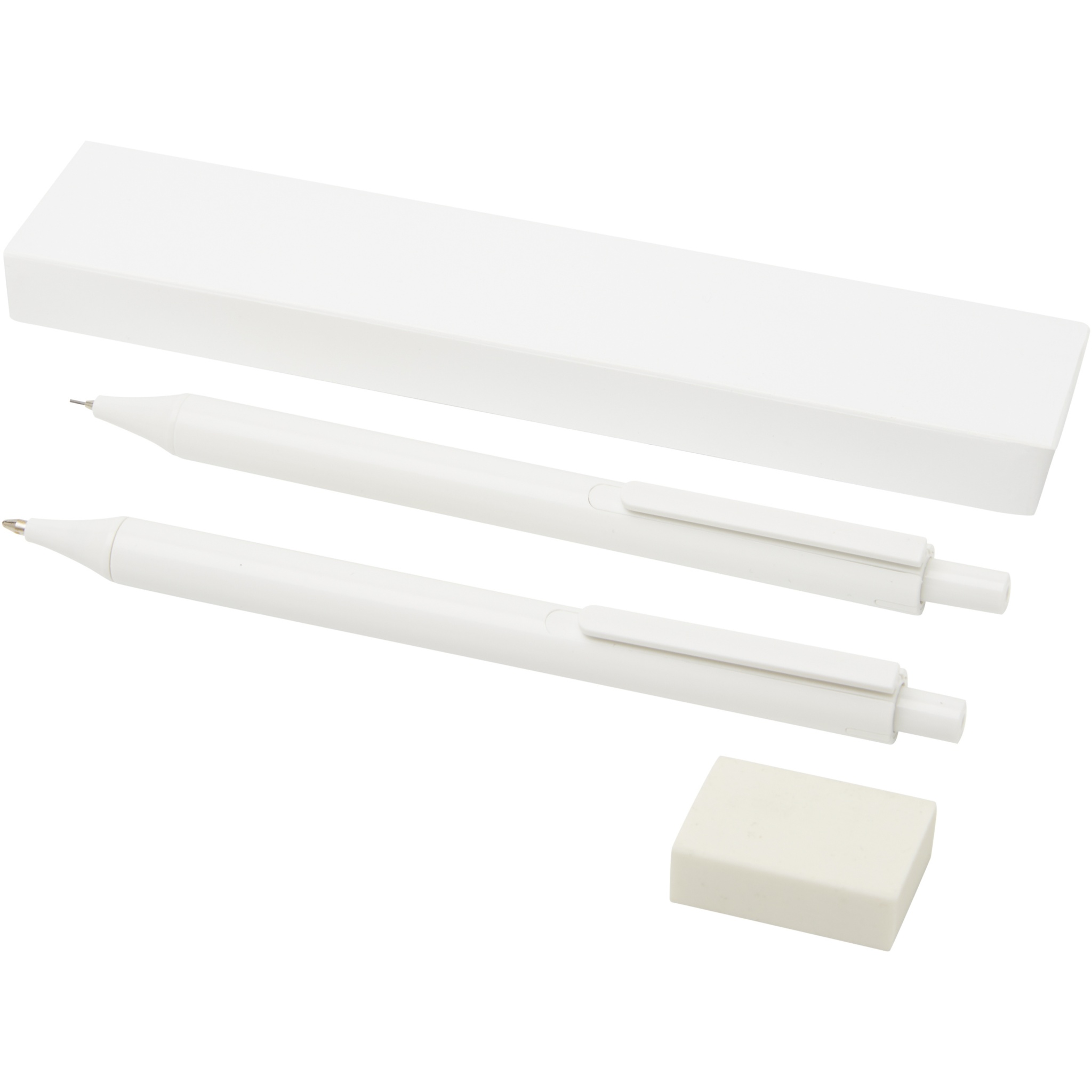 Anti-bacterial stationery set consisting of a click action ballpoint pen, mechanical pencil and eraser. The nano powder additive reduces the growth of micro-organisms on the surface of the pens.