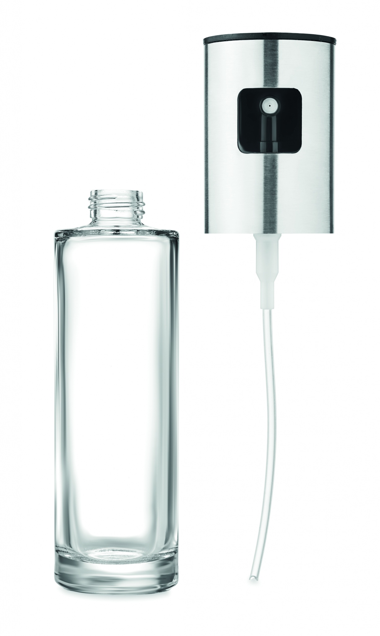 Glass oil dispenser spray with stainless steel lid. Capacity: 100 ml.