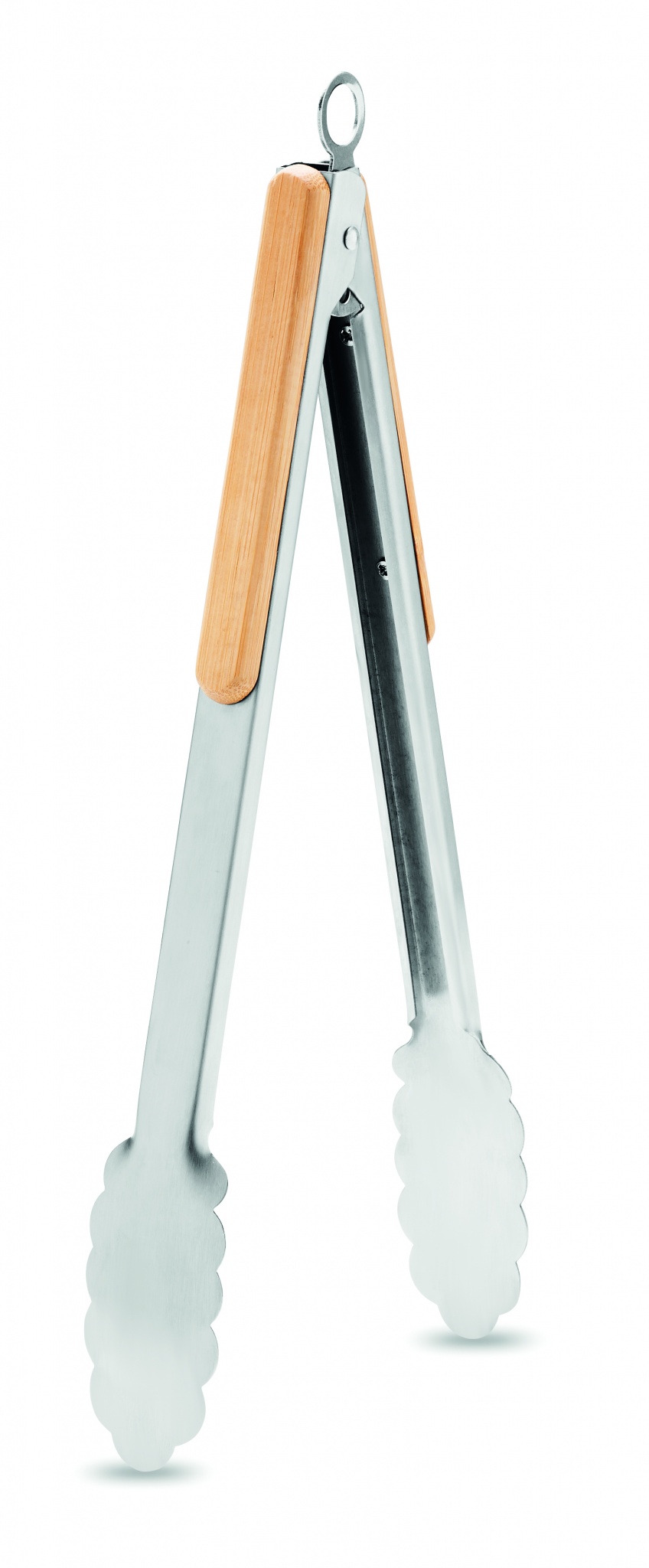 Stainless steel barbecue tongs with bamboo grips. Locking mechanism. Bamboo is a natural product, there may be slight variations in colour and size per item, which can affect the final decoration outcome.