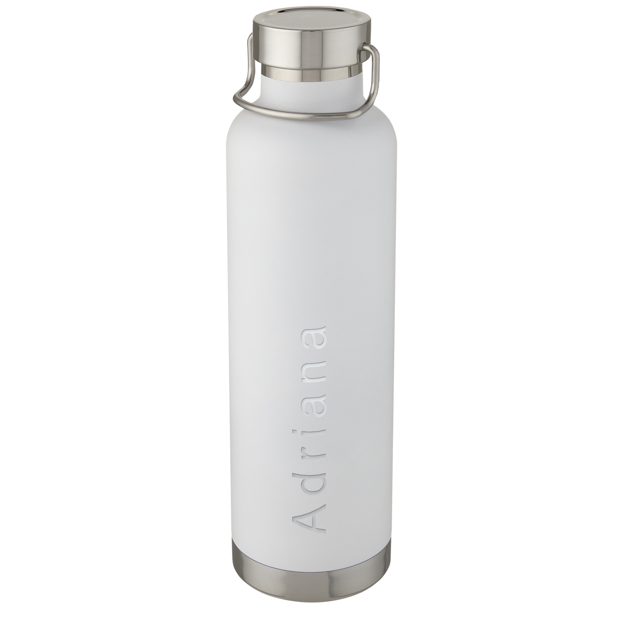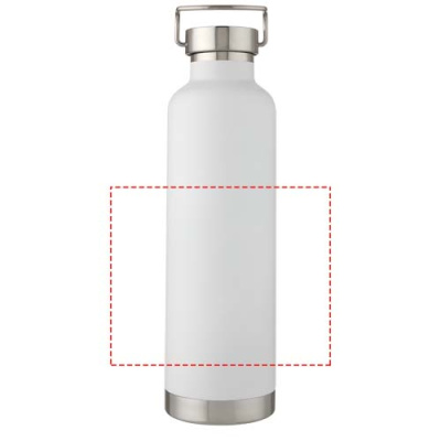 Large double-walled water bottle with 18/8 stainless steel vacuum construction and copper insulation that keeps drinks hot or cold for several hours. The construction also prevents condensation on the outside of the bottle, and the on-trend powder coating makes it extra durable. Stainless steel screw-on leakproof lid with durable stainless steel hand loop. Wide opening for easy filling, pouring and cleaning. BPA-free, tested and approved under German Food Safe Legislation (LFGB). Tested and approved for phthalates content according to REACH regulations. Perfect for ice cubes. Volume capacity is 1 L. Hand wash recommended. Presented in a recycled cardboard gift box.