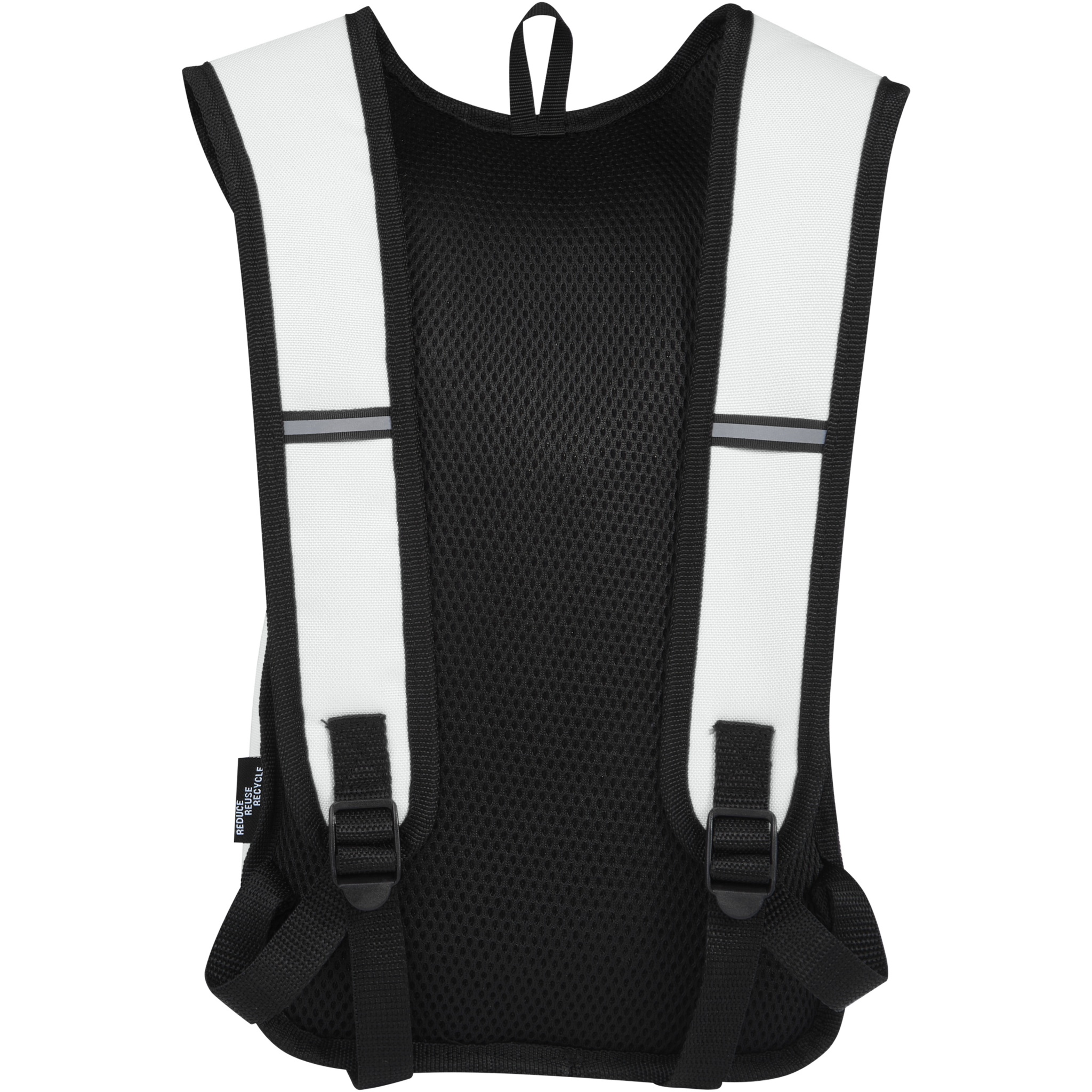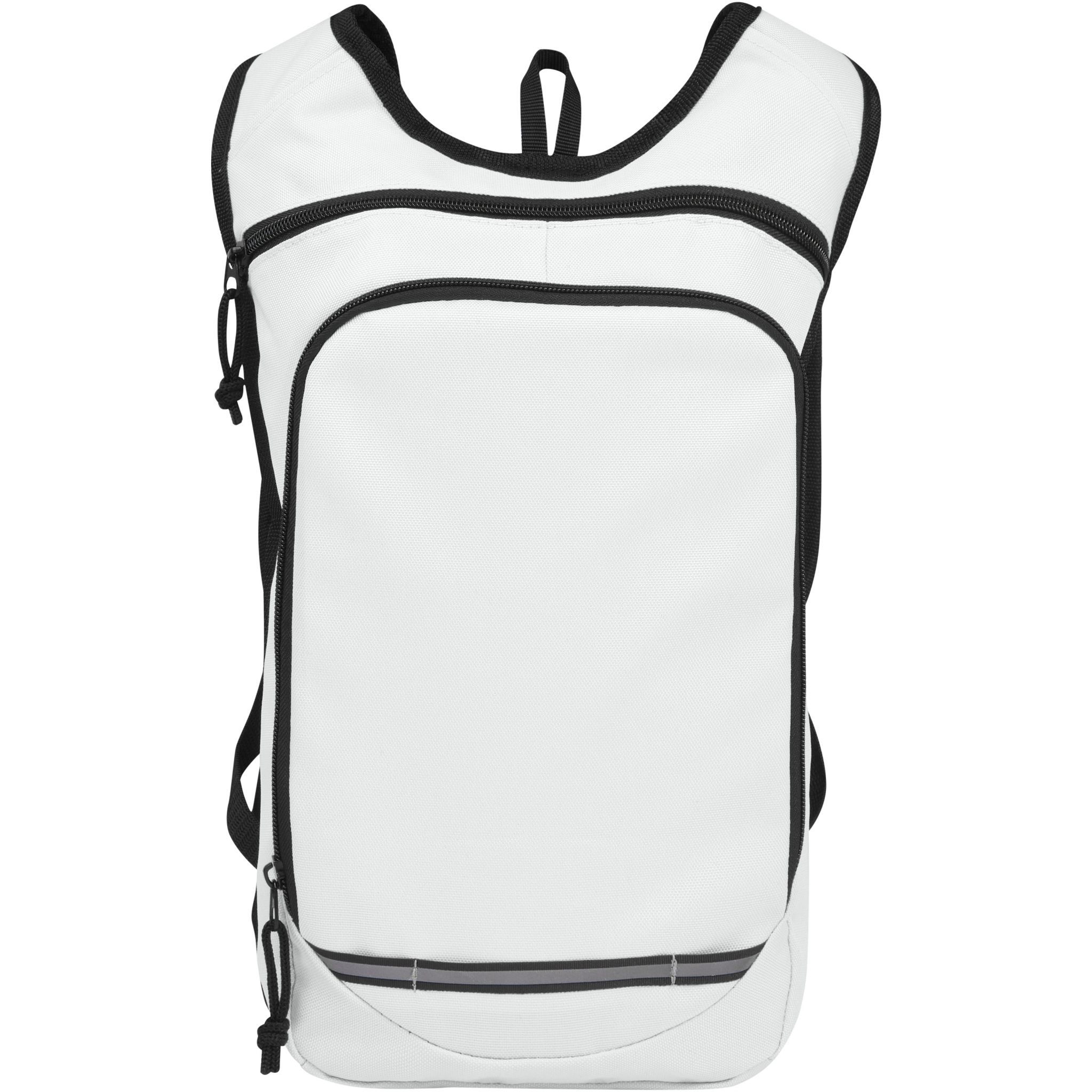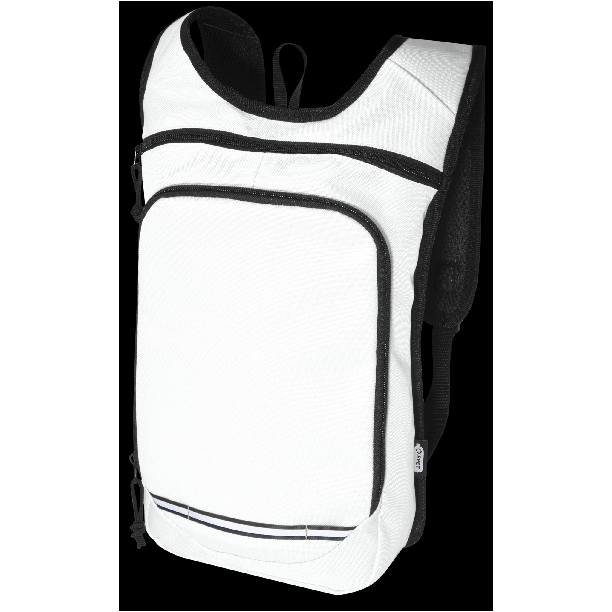 Made from 100% GRS recycled and water repellent fabric, the Trails backpack features one zippered front pocket and one zippered main compartment, and is compatible with a hydration water bladder. Reflective stripes for visibility and mesh backside for carrying comfort , making it a great sustainable choice for outdoor activities.