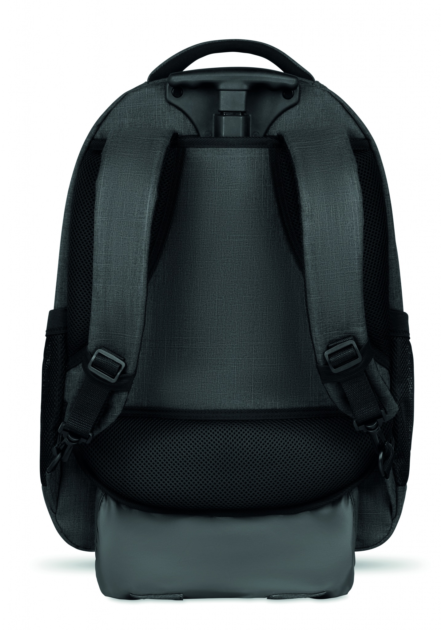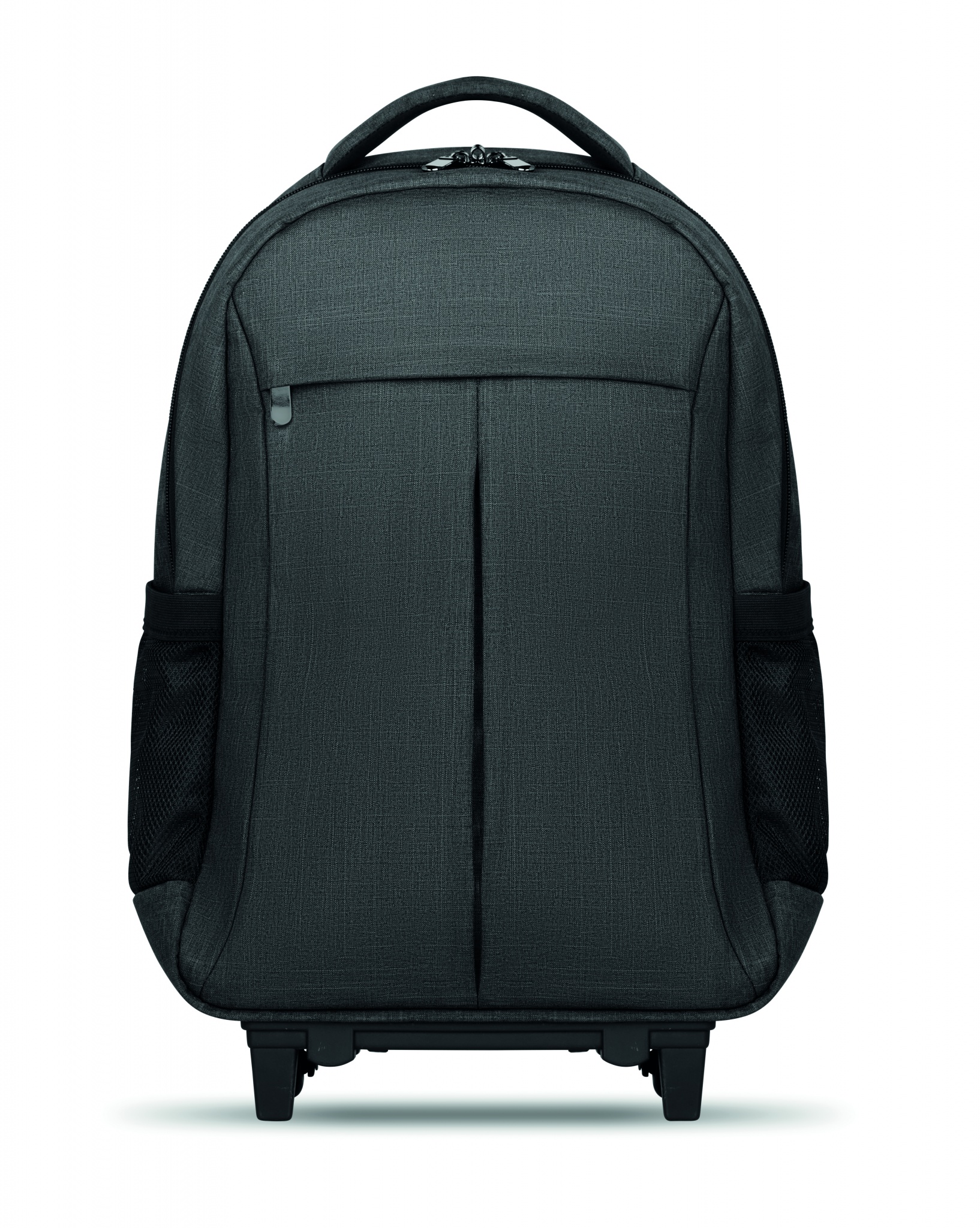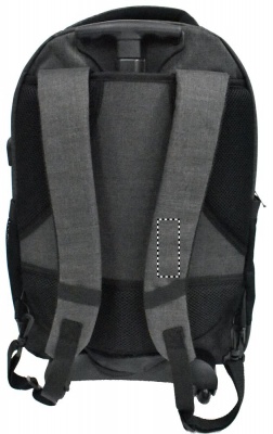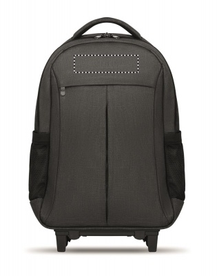 Backpack trolley in 360D 2 tone polyester. Includes one internal 15 inch laptop compartment and one main front part with zipper pocket. Padded back and shoulder straps. Includes Tablet compartment. Has an integrated sleeve for protecting the wheels when carrying.