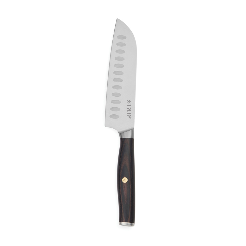 The Tara santoku knife, made from RCS-certified recycled stainless steel offers both style and versatility. The santoku knife’s blade with scalloped indentations helps to reduce food sticking to the blade, ensuing in smoother cutting and slicing. Crafted from high-quality 5Cr15Mov stainless steel, these knives boast exceptional durability and performance. The beautiful pakkawood handle provides a comfortable and secure grip, while the superb balance in the blade ensures ease of use. Size: 25.6 cm (blade 14 cm). Hand wash only to ensure a long life. Certified by RCS (Recycled Claim Standard), RSC certification guarantees that the entire supply chain of recycled materials is certified. The total recycled content is based on the overall product weight. This product contains 24% RCS-certified recycled stainless steel.