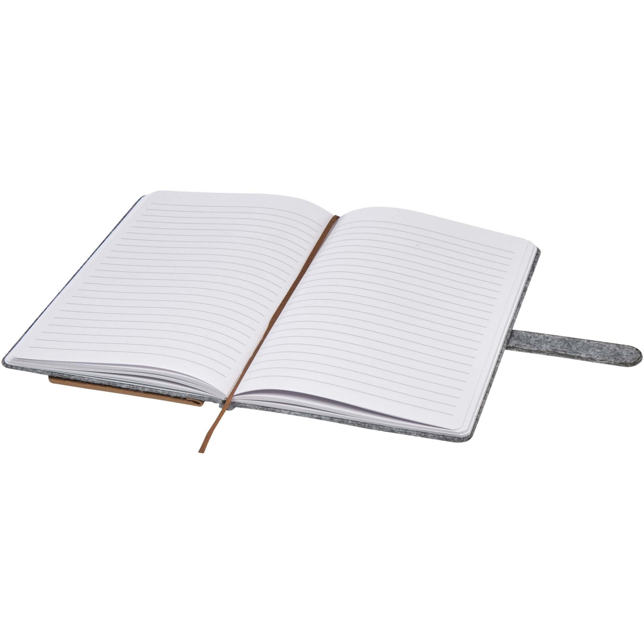 Hard cover A5 notebook made of recycled felt, and cork, with 80 lined sheets of 70 g/m² paper. The notebook includes 3 business card pockets, a matching brown ribbon, and rounded corners.