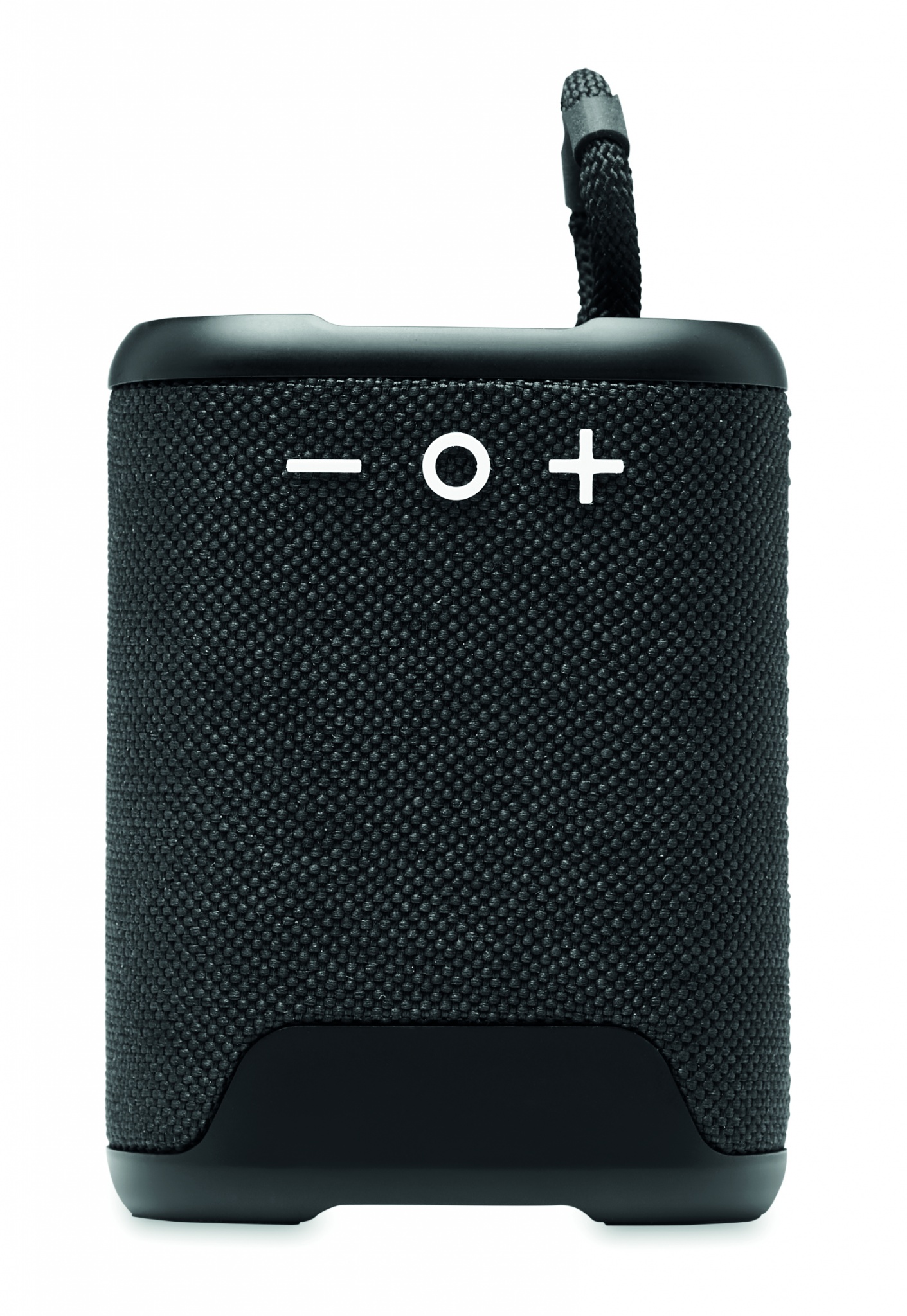 5.0 wireless speaker in ABS with 30 % hemp and 70% polyester fabric finish, IPX7 splash proof with handle. 1 Rechargeable Li-Ion 1800 mAh battery. Output data: 5W, 4 Ohm. Playing time approx. 8h.