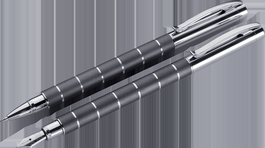 Writing set consisting of a high-quality case with flap, a ballpoint pen with a large black plastic refill and a fountain pen. Your logo will be lasered onto both writing instruments. Laser price for both writing instruments.