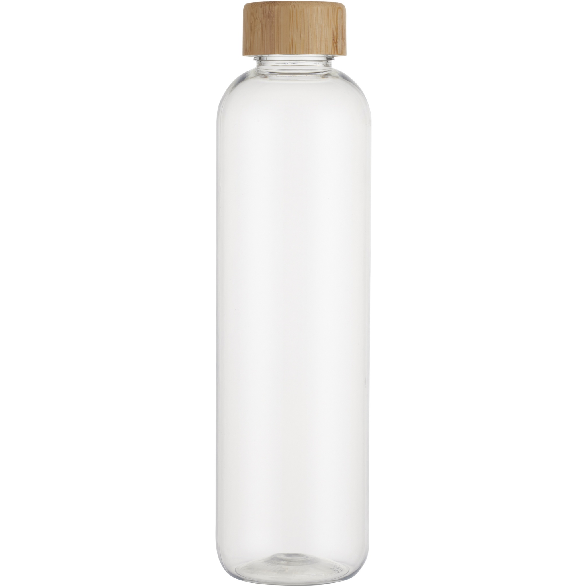 Reusable water bottle made from recycled plastic, with a stylish bamboo lid. The single walled bottle is BPA free, tested and approved under German Food Safe Legislation (LFGB). Tested and approved for phthalates content according to REACH regulations. The bamboo is from sustainable, environmentally and socially responsible sources. Volume capacity is 950 ml. Hand wash recommended. Presented in a recycled cardboard gift box.