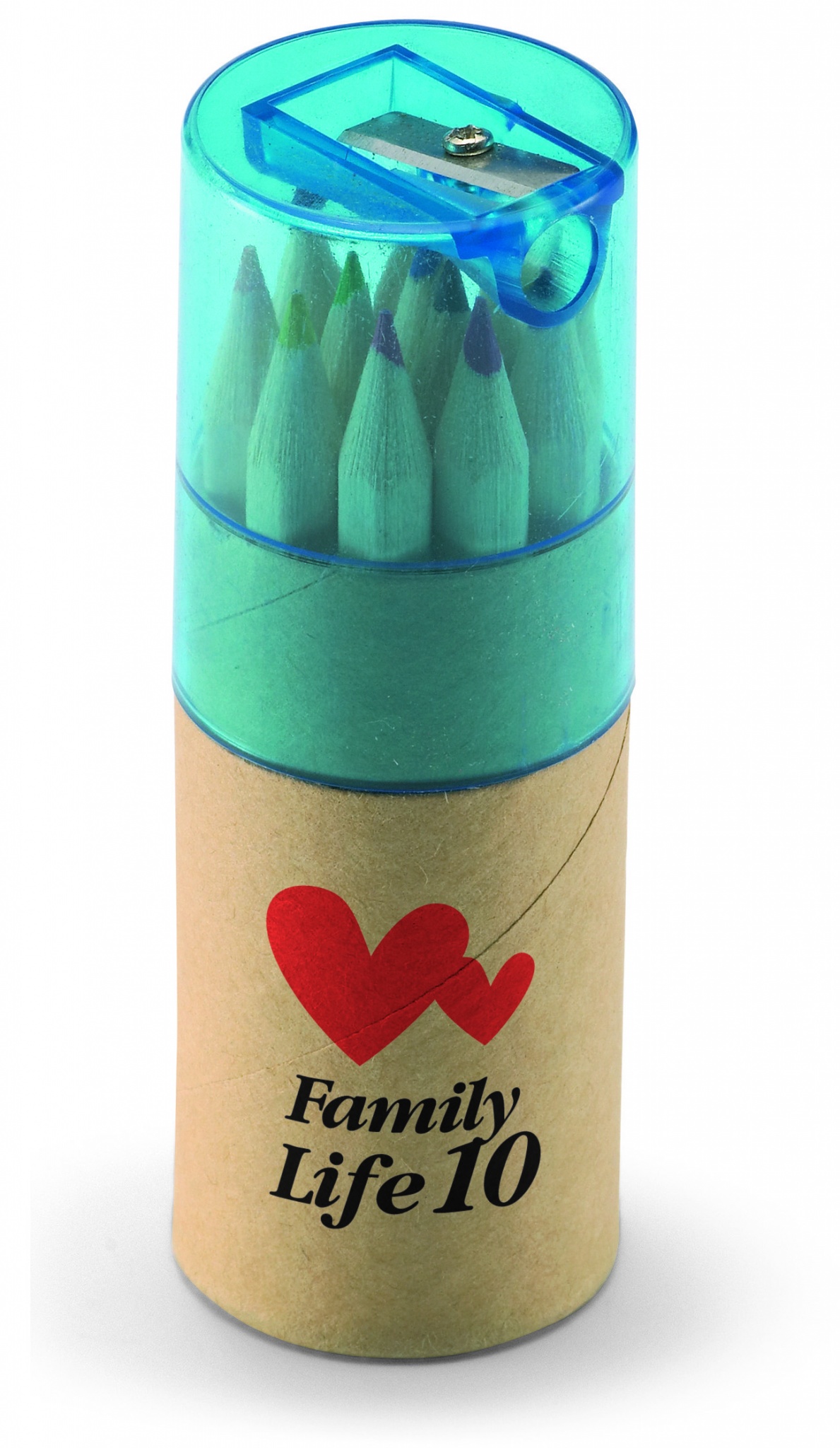 12-osaline värvipliiats tuubis. Pliiatsiteritaja läbipaistev kaas.
