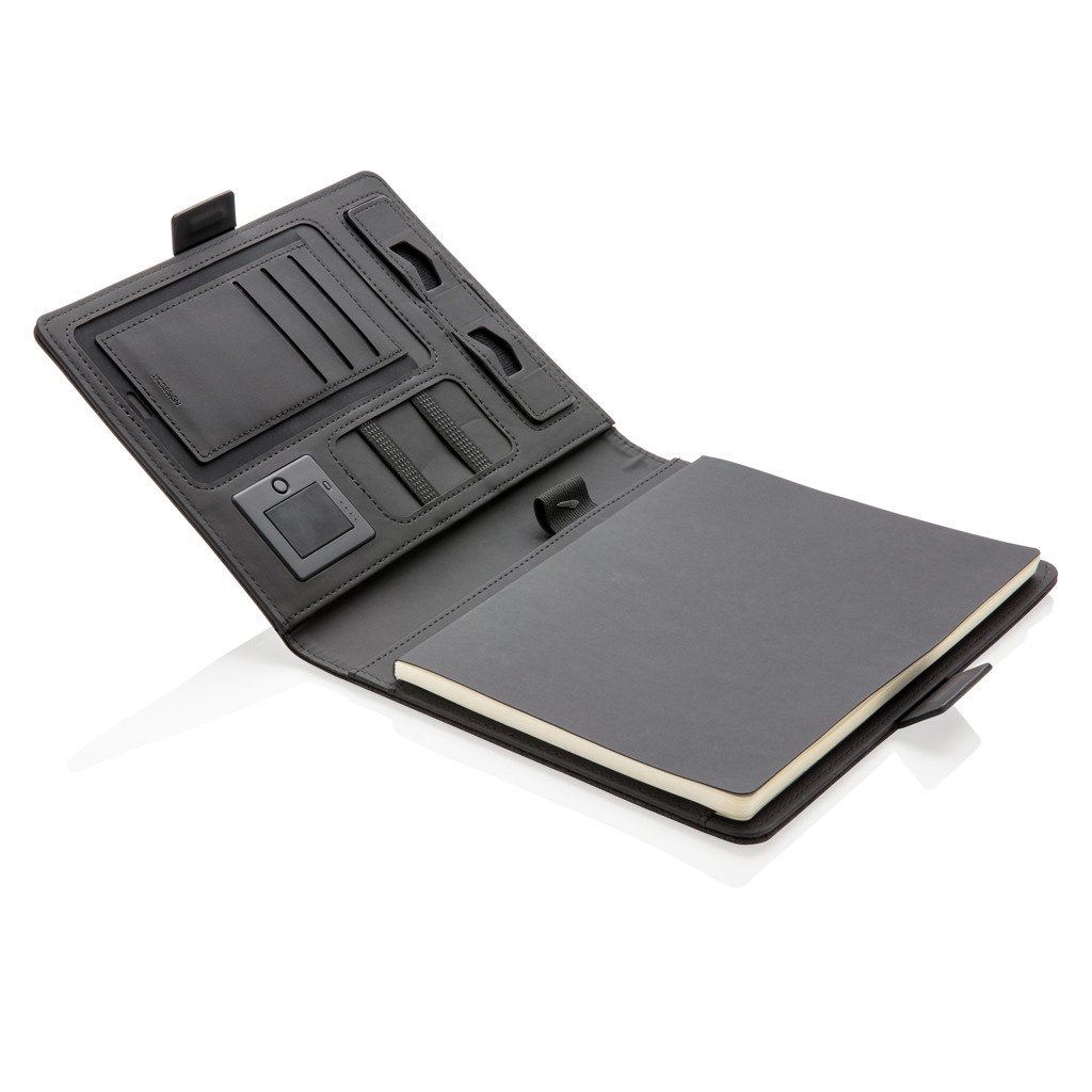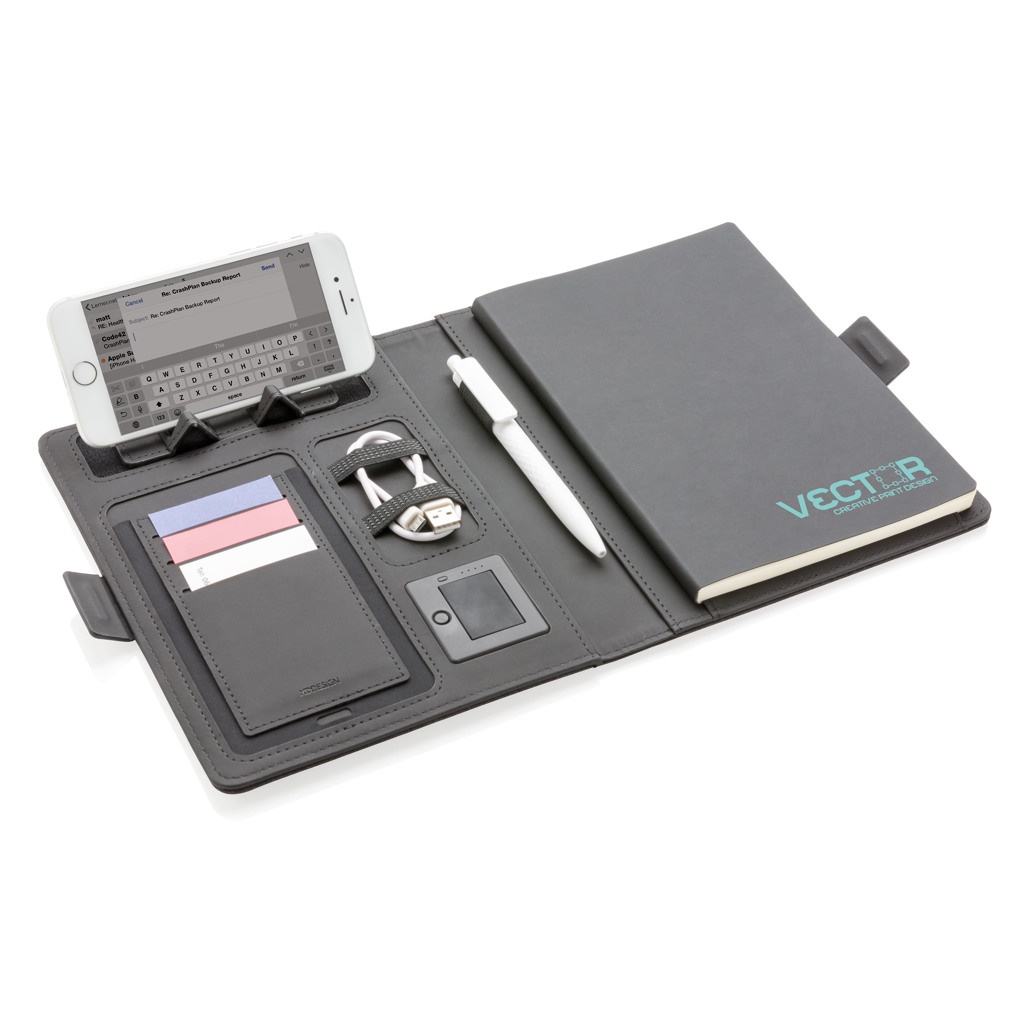 Sellel eemaldatava sülearvutiga sülearvutikaanel (128 joonitud lehekülge 80 g/m²) on uusim tehnoloogia. Esikaanel on juhtmevaba laadimisalus teie telefoni jaoks. (Androidi uusimad põlvkonnad, iPhone 8 ja uuemad). Vanemaid telefone ja tahvelarvuteid saab laadida USB-portide kaudu 4000 mAh akupangast. Unikaalsed USB-pordid avanevad ühe nupuvajutusega. Sisend: 5.0V/1.0A. Väljund: 5,0V/2,1A. Juhtmeta väljund: 5W. Registreeritud disain®