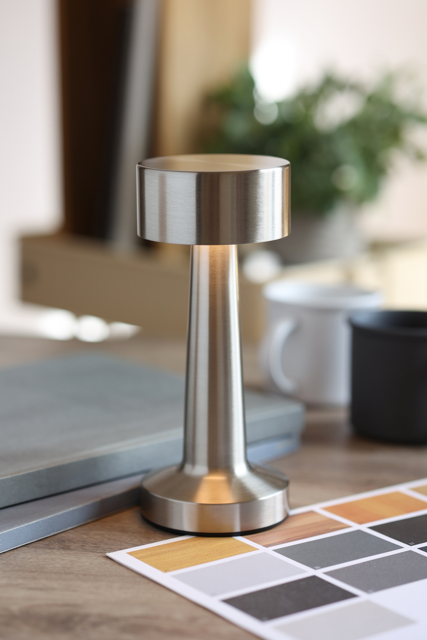 Rauast laualamp 12 LED-tulega, astmeteta hämardamise, 3 valgusrežiimi ja puutetundliku juhtimisega. USB-port ja taaslaetav Li-Ion 1200 mAh aku. 6-tunnine tööaeg pärast täielikku laadimist. Kaasa arvatud laadimiskaabel.