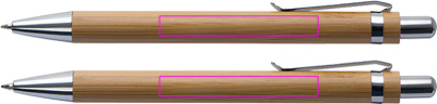 Bambusest kirjutuskomplekt, mis sisaldab pappkarbis sinisekirju pastapliiatsit ja mehaanilist pliiatsit. Graveerime mõlemale pastakale klambri alla teie logo.