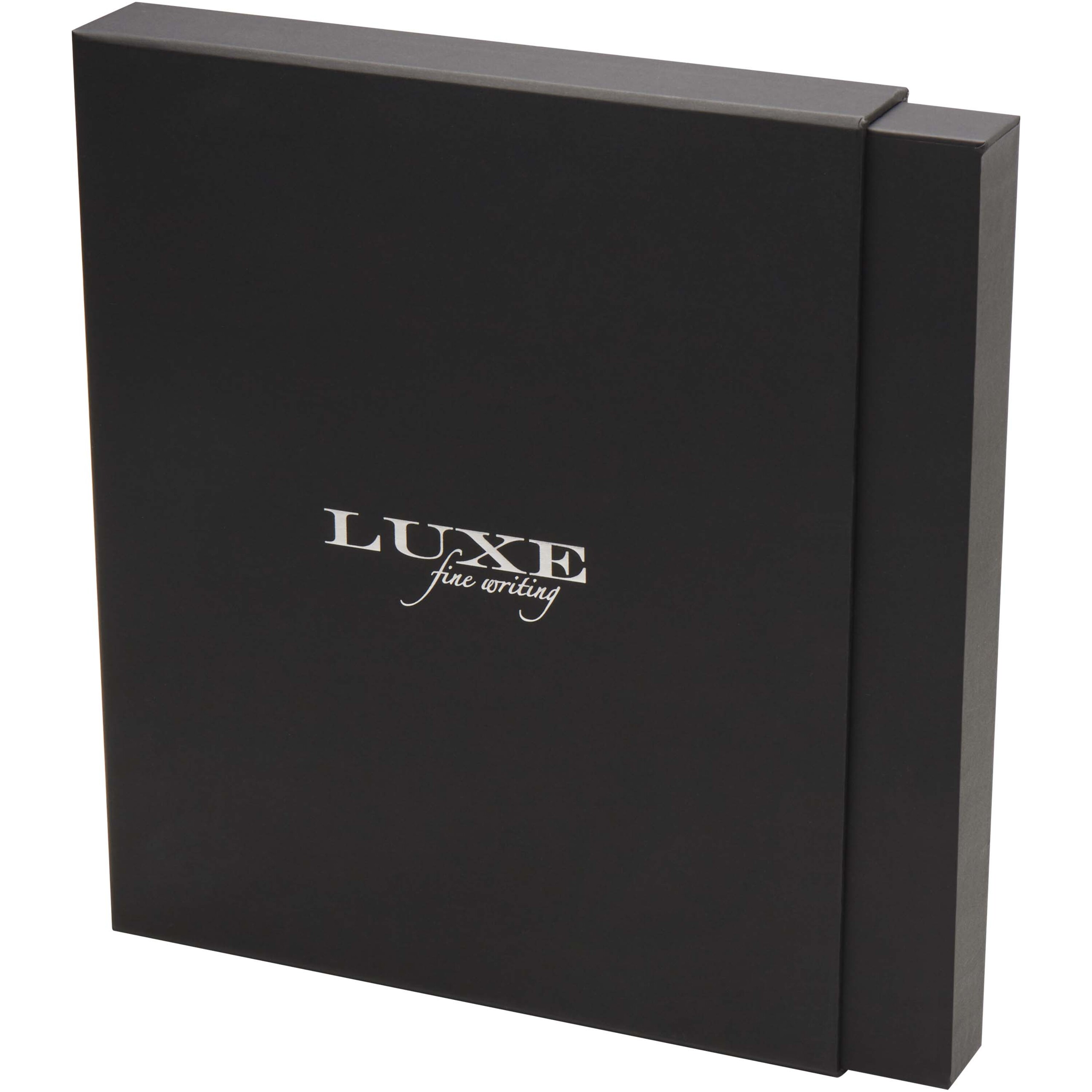 Legato on elegantne kombinatsioon A5-formaadis sülearvutist ja rullpliiatsist. Pliiatsil on taaskasutatud messingist ülemine silinder, millel on kuldne kroomitud viimistlus, alumine silinder on musta/pruuni pihustuskattega, metallist kullast kroomitud tarvikud ja LUXE logo keskmisel rõngal. Tindi värv: must. Kirjutamise pikkus: 400 meetrit. Otsa suurus: 0,7 mm. Märkmikul on 80 lehte 80 g/m² joonega paberit, taaskasutatud plastikust kate, elastne sulgur, lintmarker ja akordionitasku. Kuldne kroomitud metallist tarvik elastsel sulguril. Tarnitakse taaskasutatud papist kinkekarbis.