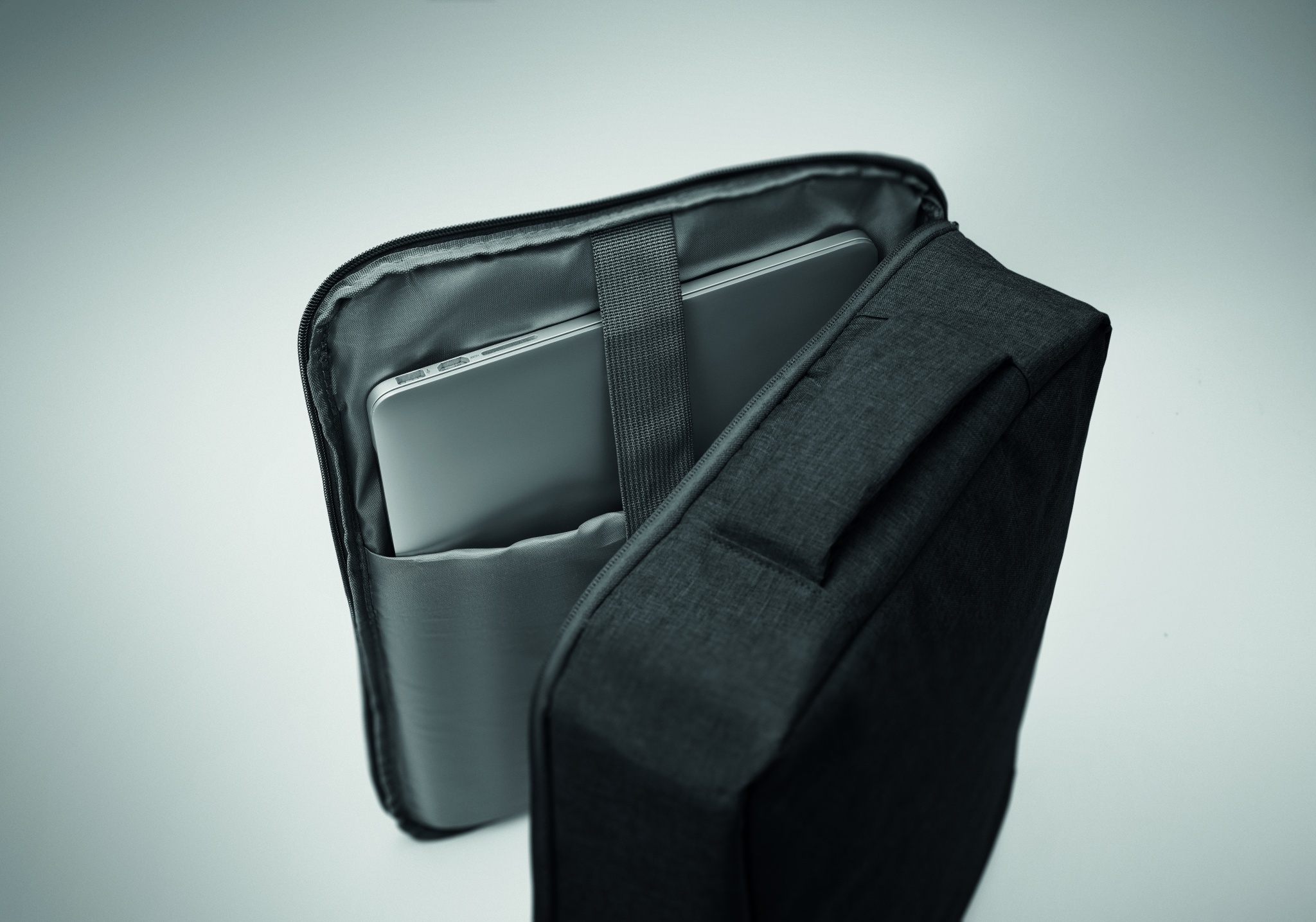 Õhuke 15-tolline sülearvuti seljakott 300D RPET-ist turvalise 180-kraadise avanemisega ja 210D RPET-voodriga. Sisaldab sülearvuti sahtlit, 2 sisemist taskut, 2 sisemist pliiatsitaskut ja 2 polsterdatud kandesanga. Pehme polsterdatud selja- ja õlarihmad. Kohvri varrukas.