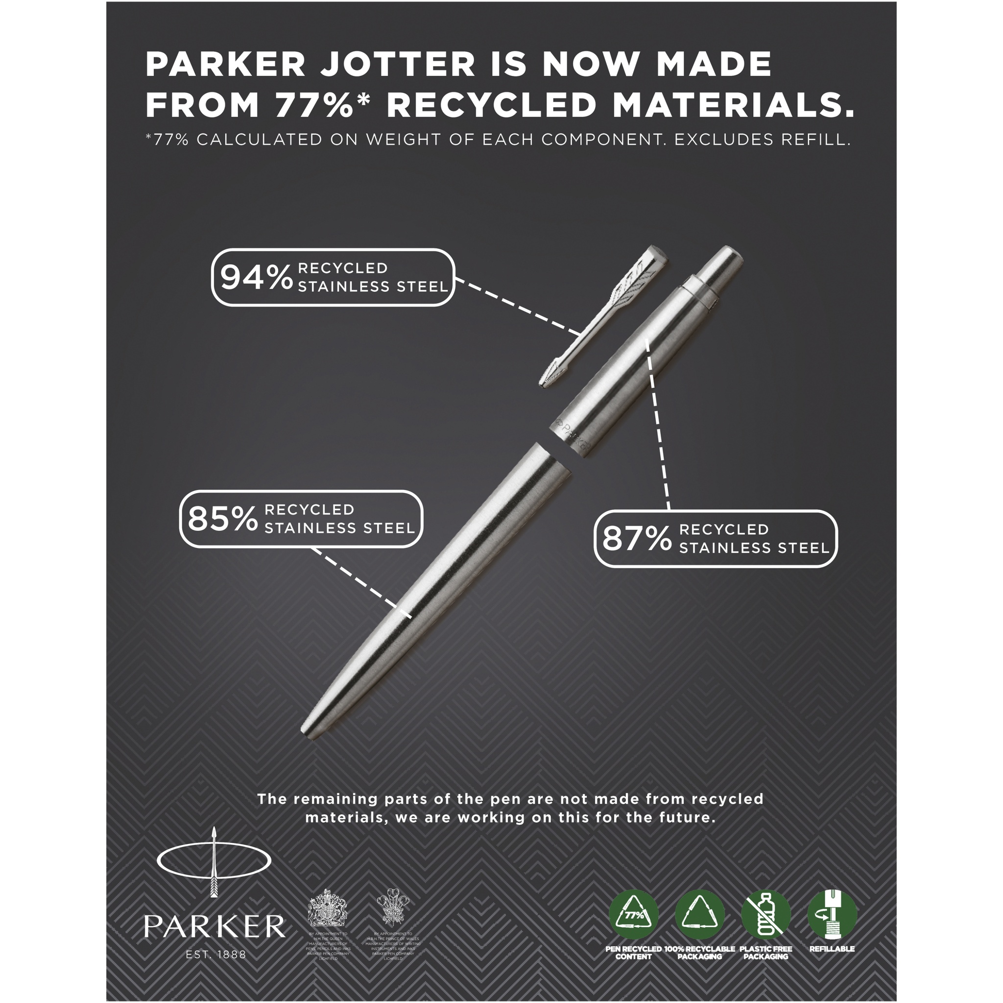 Jotter on viimase 60 aasta autentne disainiikoon. Ihaldusväärsete värvide ja eristuva kujuga Jotter jääb Parkeri populaarseimaks pliiatsiks, mis on äratuntav kuni selle tunnusklõpsuni. Sealhulgas Parkeri kinkekarp. Tarnitakse patenteeritud QuinkFlow kuulitäidisega. Eksklusiivne disain.