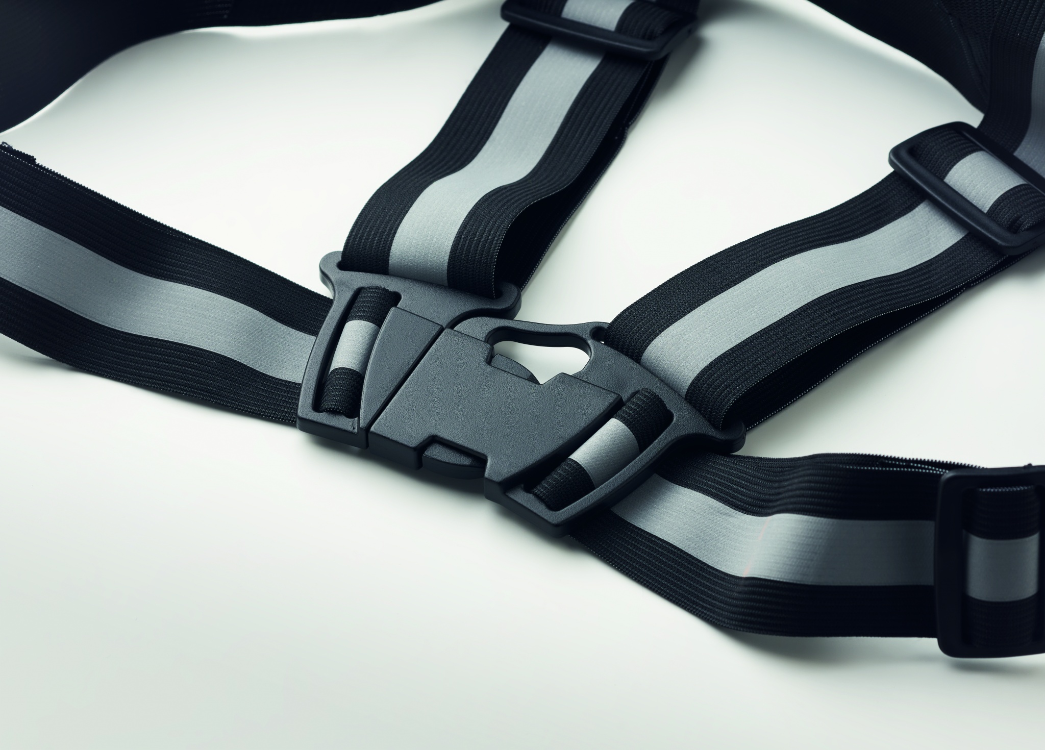Hõbedaste triipudega reguleeritav 360° helkurvöö. Ainult reklaamiks kasutamiseks.