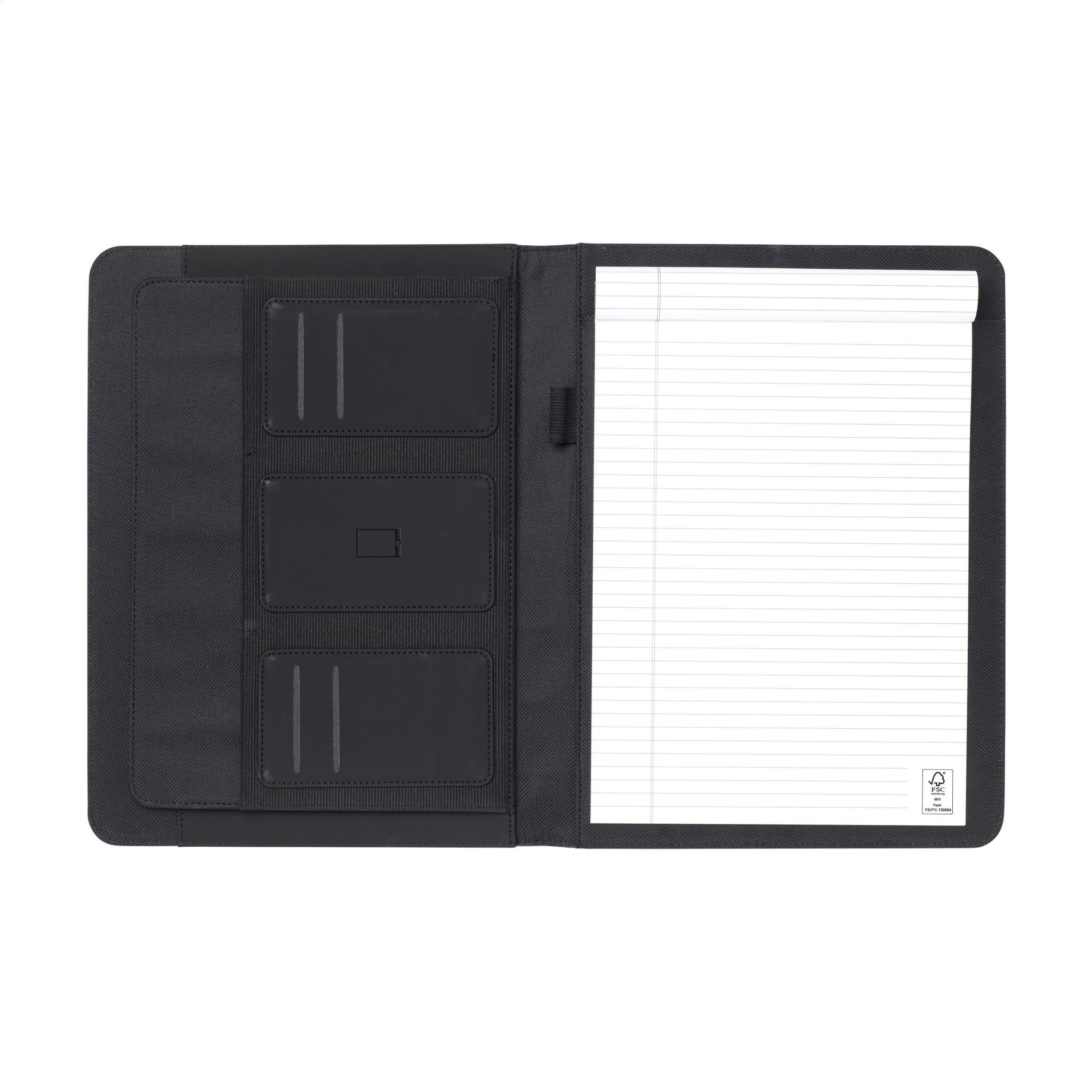 Vau! Moodne A4-formaadis kirjutatav dokumendikaust tugeva polsterdatud kaanega, mis on valmistatud RPET-ist. Kausta sees on käepärane pliiatsi aas, erinevad sisetaskud, sealhulgas eraldi sahtel mobiiltelefoni ja krediitkaartide hoidmiseks. Kaasas märkmik 30 joonelise paberilehega (70 g/m²). Säästlik ja keskkonnasõbralik toode.