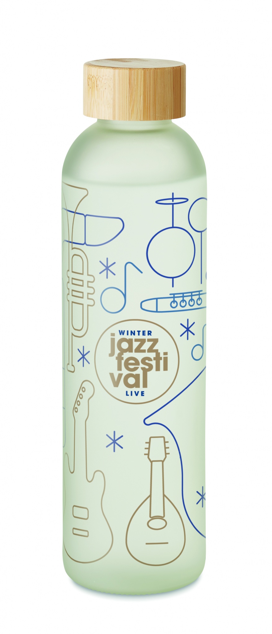 Spetsiaalse sublimatsioonikattega klaaspudel ja bambusest kaas. Mahutavus: 650 ml. Bambus on looduslik toode, ühe eseme värvis ja suuruses võib esineda väikesi erinevusi, mis võivad mõjutada lõppviimistlust.