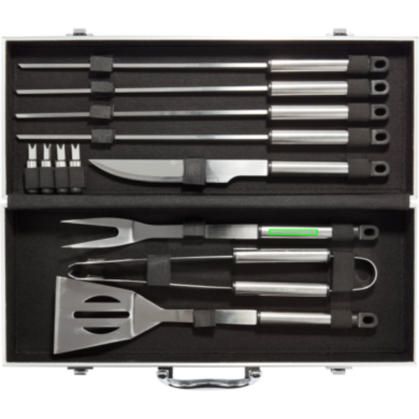 12 kpl ruostumaton BBQ-setti, sisältää 4 paistohaarukkaa, lihaveitsen, 4 maissintähkänpidintä, paistolastan, lihahaarukan suojuksella ja paistopihdit. Pakattu alumiinilaatikkoon, saranat ja kahva.