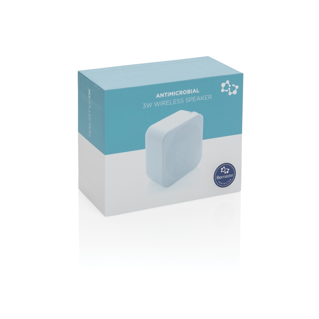 3W langaton kaiutin, joka on käsitelty Biomasterilla, antimikrobisella aineella, joka tuo lisäsuojaa haitallisia bakteereja vastaan. Biomasteria on tuotteen sisällä, eikä vain päällä, mikä varmistaa kestävän suojan. Antimikrobisuus estää haitallisten mikro-organismien, kuten bakteerien, lisääntymisen ja tuhoaa ne. Tuote on testattu ISO 22196 antimikrobisen tehokkuuden standardien mukaisesti, ja se on 100% turvallinen ja vaaraton käyttäjille. Biomaster ei vaikuta tuotteen kierrätettävyyteen. Tuotteessa on myös Verimaster -jäljitysainetta, joka todentaa, että tuote on käsitelty Biomasterilla, toisin kuin lukuisat muut samankaltaiset tuotteet. Kaiuttimessa on 300mAh:n akku, jolla voit kuunnella musiikkia jopa kolmen tunnin ajan, ja joka voidaan ladata täyteen 1.5 tunnissa. BT 5 varmistaa jopa 10 metrin toimintaetäisyyden. Pakattu lahjalaatikkoon, jossa myös selutys Biomasterista. Sisältää PVC-vapaan TPE micro latauskaapelin.