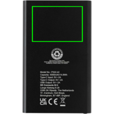 4.000 mAh:n litteä virtapankki, jonka kotelo on valmistettu RCS-sertifioidusta kierrätysalumiinista/ABS-muovista. RCS (Recycled Claim Standard) on standardi, jonka avulla tuotteen kierrätyspitoisuus voidaan todentaa koko toimitusketjussa. Kierrätetyn materiaalin kokonaismäärä:: 36% tuotteen kokonaispainosta. Virtapankki tukee sekä USB A että C-tyypin kautta tapahtuvaa latausta. Virtapankki sisältää pitkäkestoisen 4.000 mAh:n A-luokan litiumpolymeeriakun. Virran merkkivalot ilmoittavat jäljellä olevan energiatason, joten tiedät aina, milloin tuote tulee ladata uudelleen.; C-tyypin tulo 5V/2A; C-tyypin lähtö: 5V/2A USB A -lähtö: 5V/2A. Tuote ja tarvikkeet PVC-vapaita. Mukana RCS-sertifioitu kierrätetty TPE-latauskaapeli. Pakattu FSC® mix -pakkaukseen.