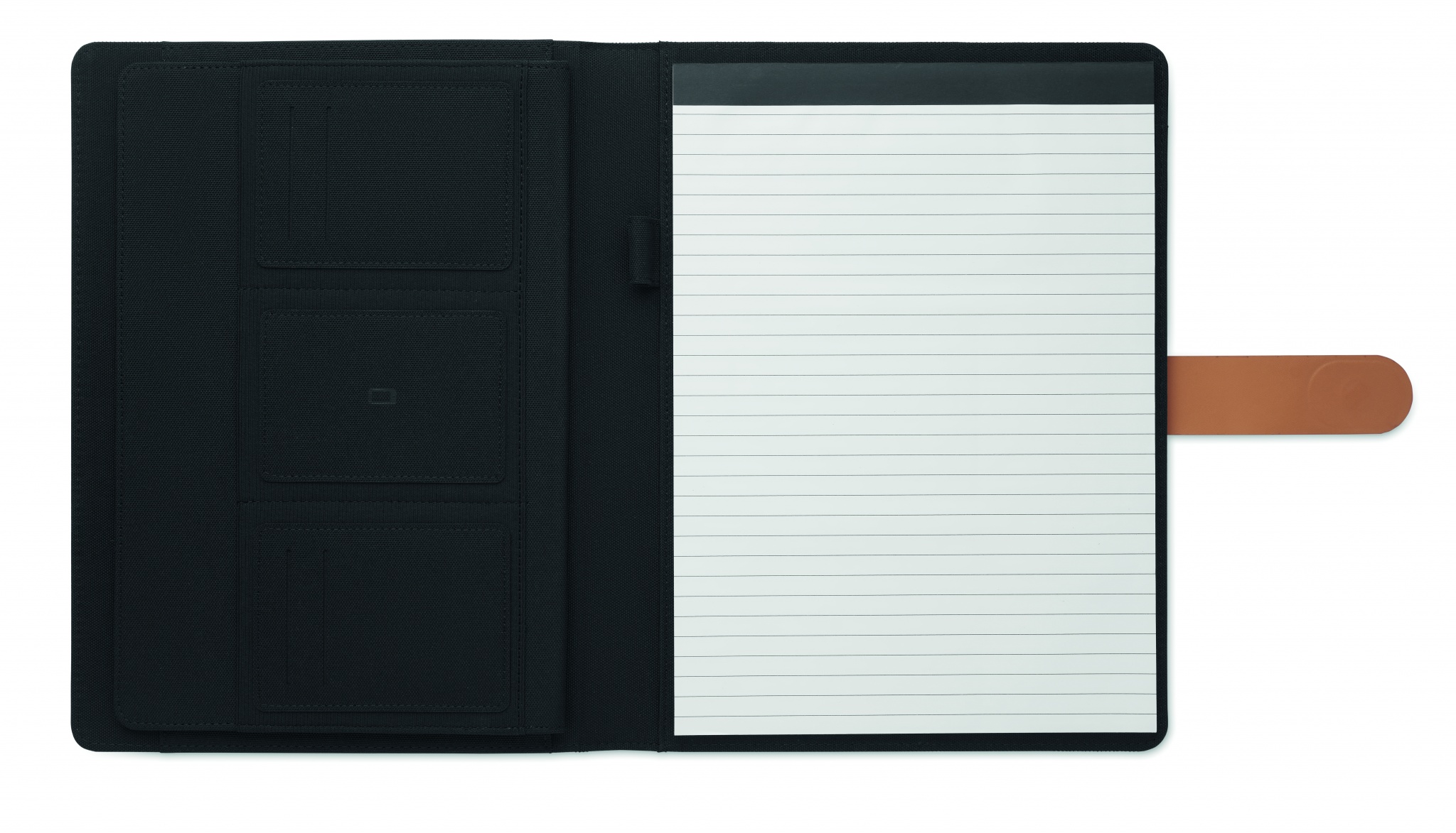 A4-salkku RPET-materiaalista, jossa on keinonahkaisia yksityiskohtia. Uudelleentäytettävä A4-muistilista. 30 viivoitettua sivua kierrätyspaperista. Kynäteline. 4 korttipidikettä, 3 pientä taskua ja yksi iso lokero. Magneettihihnasuljenta.