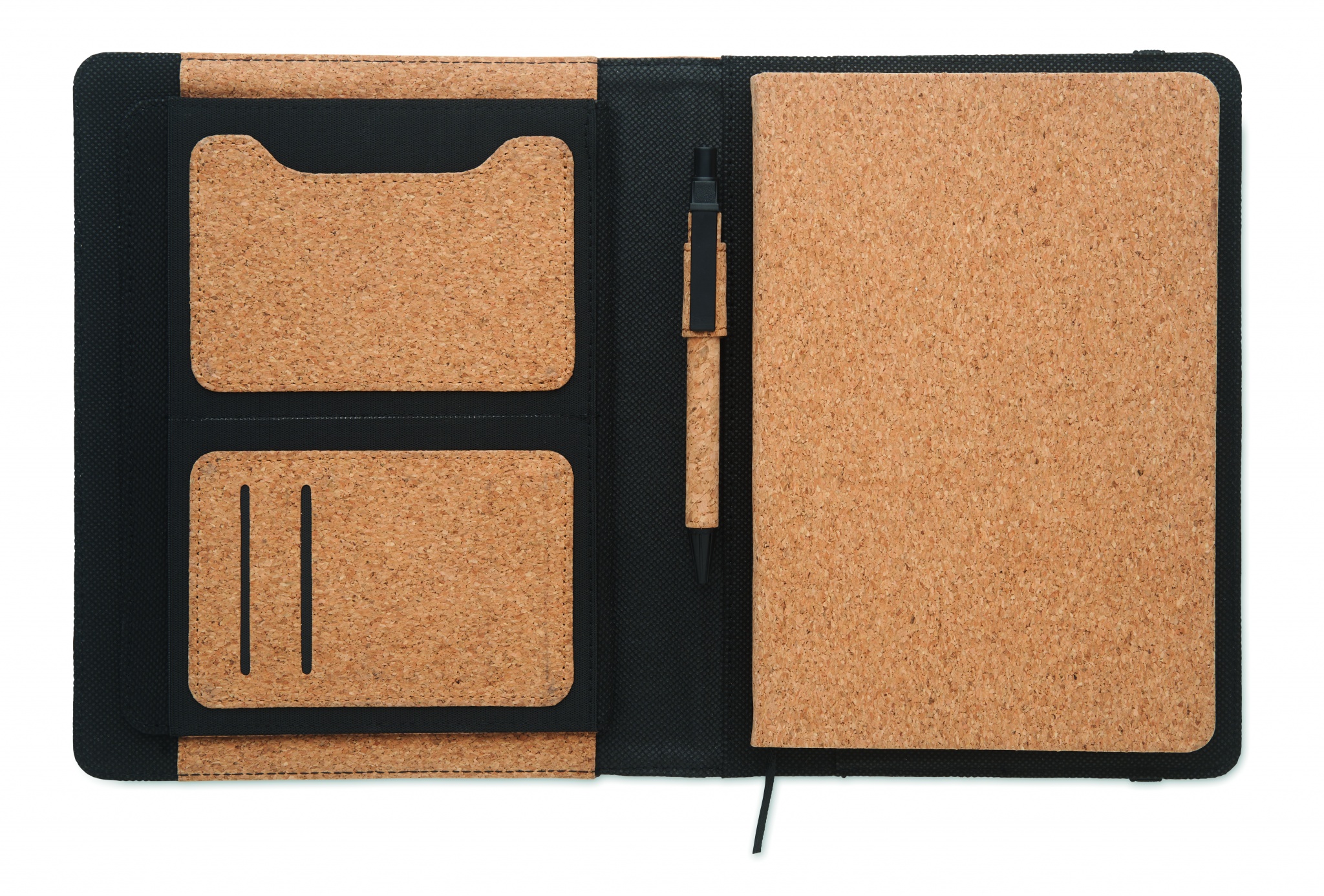 A5-korkkikansio. Vaihdettava A5-muistikirja, jossa on kova korkkikansi. 192 sivua kierrätyspaperista (96 arkkia). Mukana kynä ja sille pidike. 2 korttitaskua ja yksi suuri lokero. Joustava sulkuhihna.