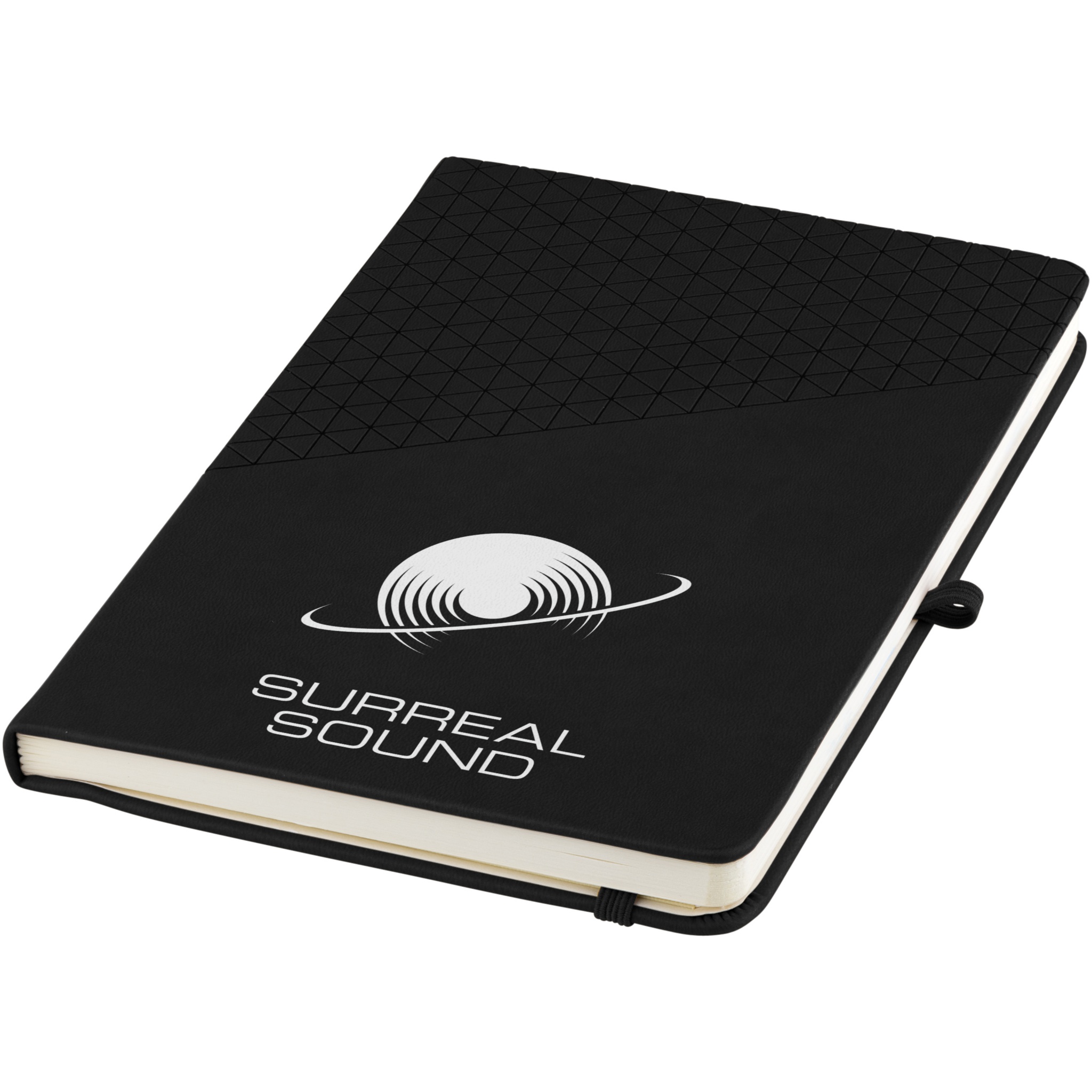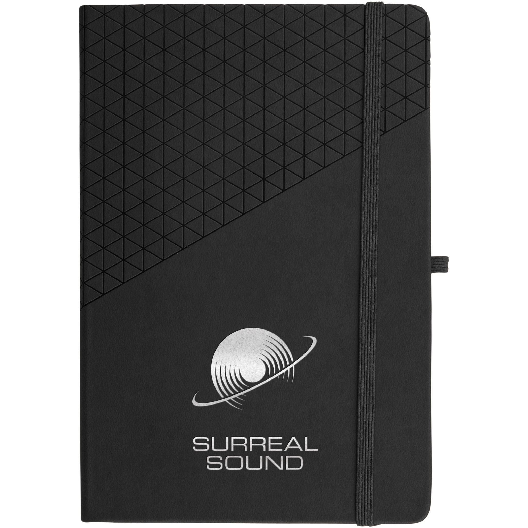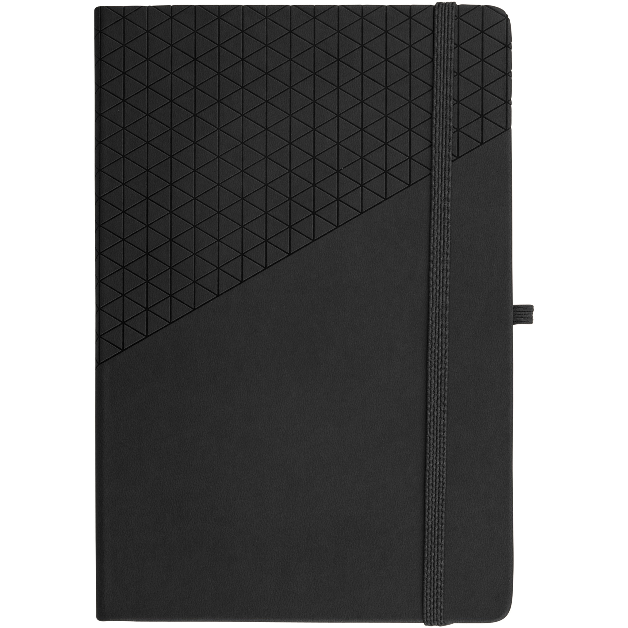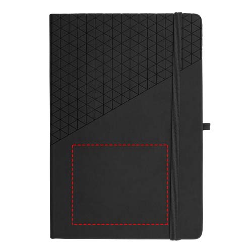 Soft touch muistivihko A5, geometrinen kuviointi. 80 sivua (80 gsm) viivoitettua paperia, sivumerkki, joustava suljenta ja kynälenkki.