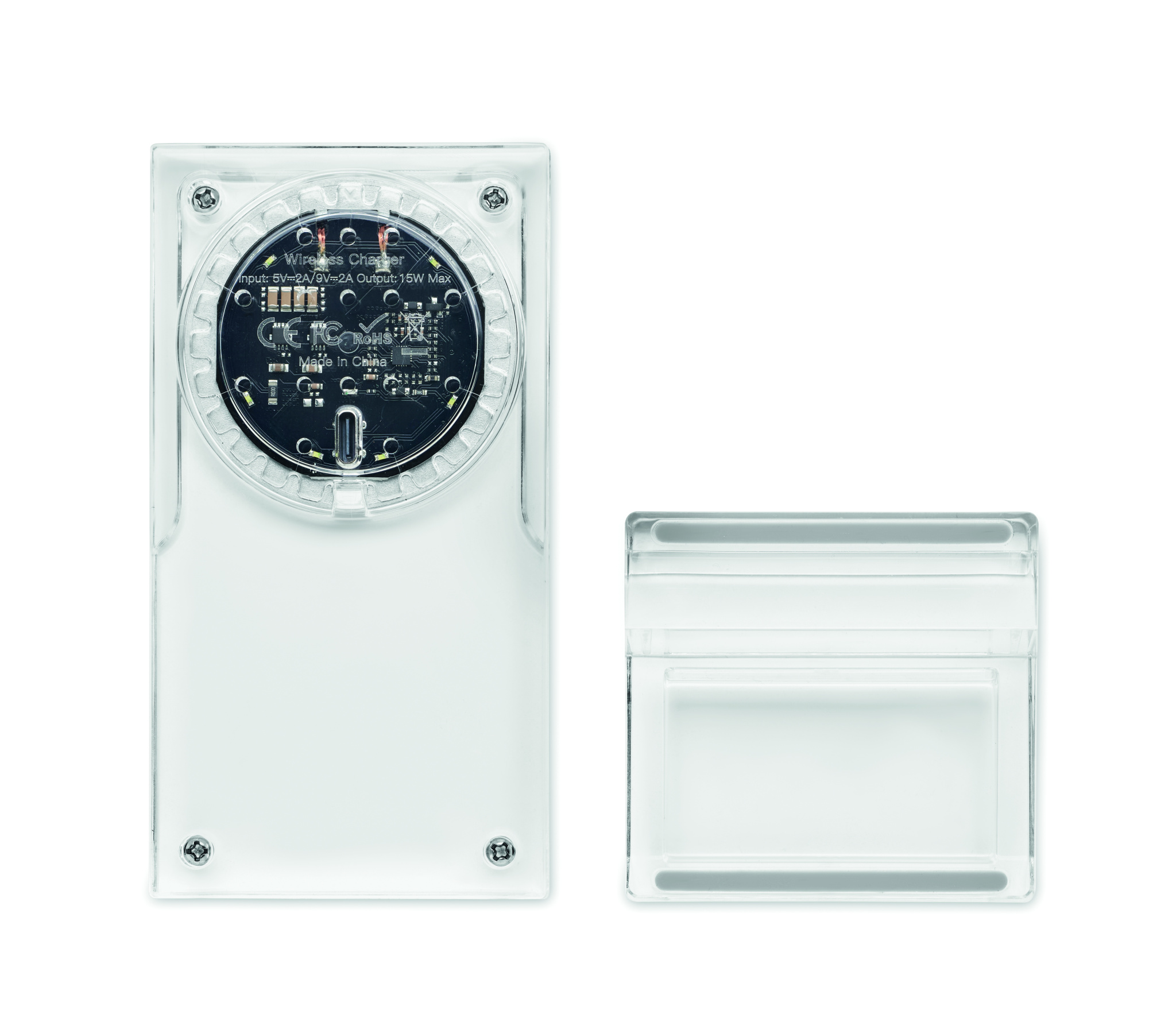Langaton laturi (15 W) akryyliä ja puhelinteline. Kun se on kytketty virtalähteeseen, se lataa mobiililaitteesi langattomasti. Lähtöteho: 9 V / 1,67 A (15 W) nopeaan lataukseen.