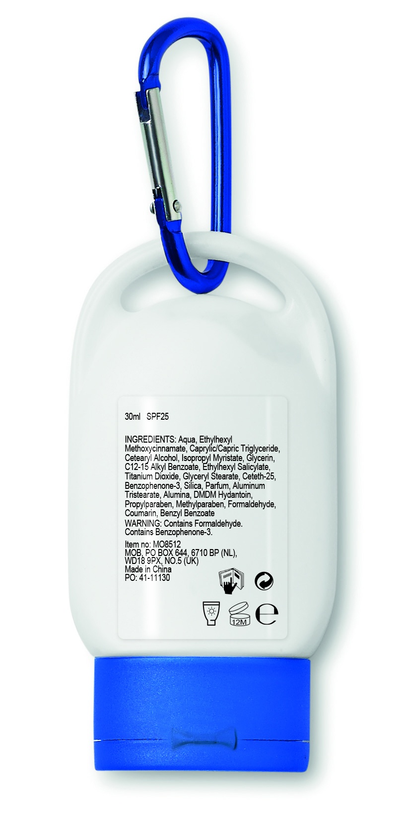 30 ml aurinkovoide karabiinikoukulla. Karabiinikoukkua ei ole tarkoitettu kiipeilemiseen (ei ammattikäyttöön) SPF25