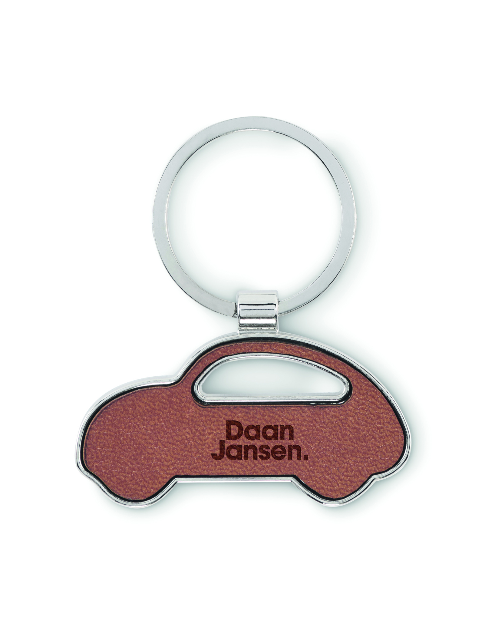 Auton muotoinen metallinen avaimenperä kierrätetyllä PU-nahalla.
