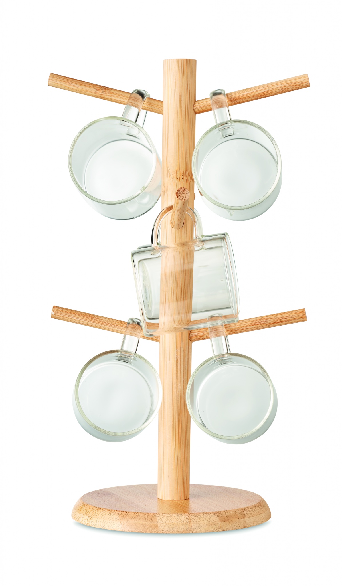 Bambusta valmistettu kuppiteline, 6 x 200 ml borosilikaattilasi kupilla. Luonnollisen materiaalin (bambu) vuoksi, tuotteiden värissä/ koossa saattaa olla erinäisyyksiä ja tämä voi vaikuttaa painatuksen lopputulokseen.