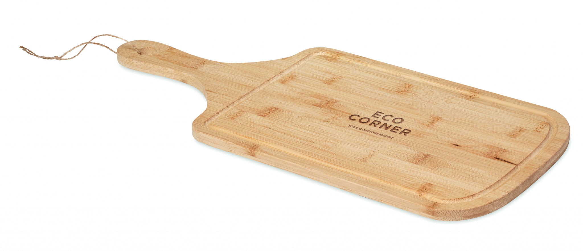 Bambusta valmistettu leikkuulauta juuttinarulla, leikkuulaudan ripustamiseen. Luonnollisen materiaalin (bambu) vuoksi, tuotteiden värissä/ koossa saattaa olla erinäisyyksiä ja tämä voi vaikuttaa painatuksen lopputulokseen.