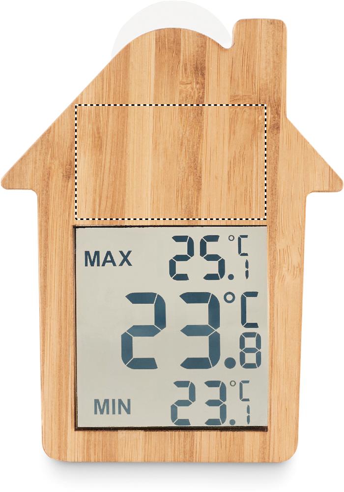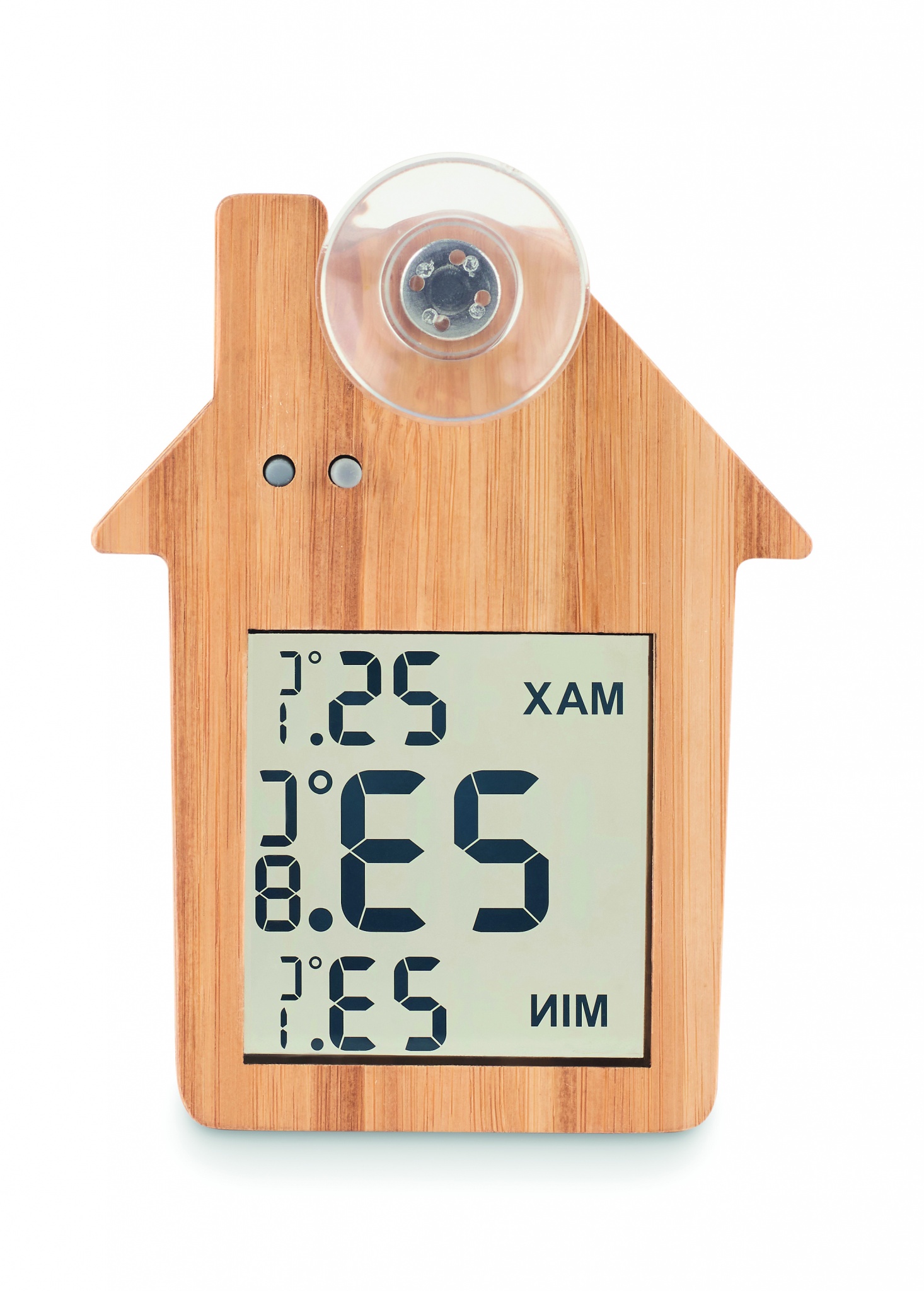 Talon muotoinen bambusta valmistettu sääasema, takana imukuppi tuotteen kiinnittämiseen ikkunaan. Sisältää LR44 patterin. Luonnollisen materiaalin (bambu) vuoksi, tuotteiden värissä/ koossa saattaa olla erinäisyyksiä ja tämä voi vaikuttaa painatuksen lopputulokseen.