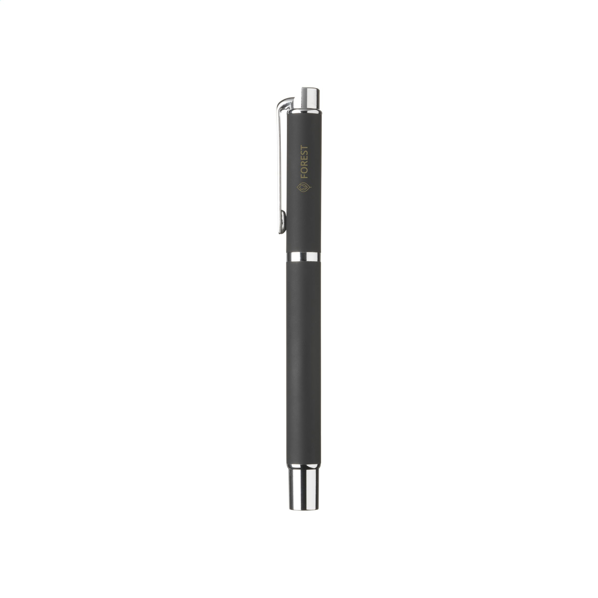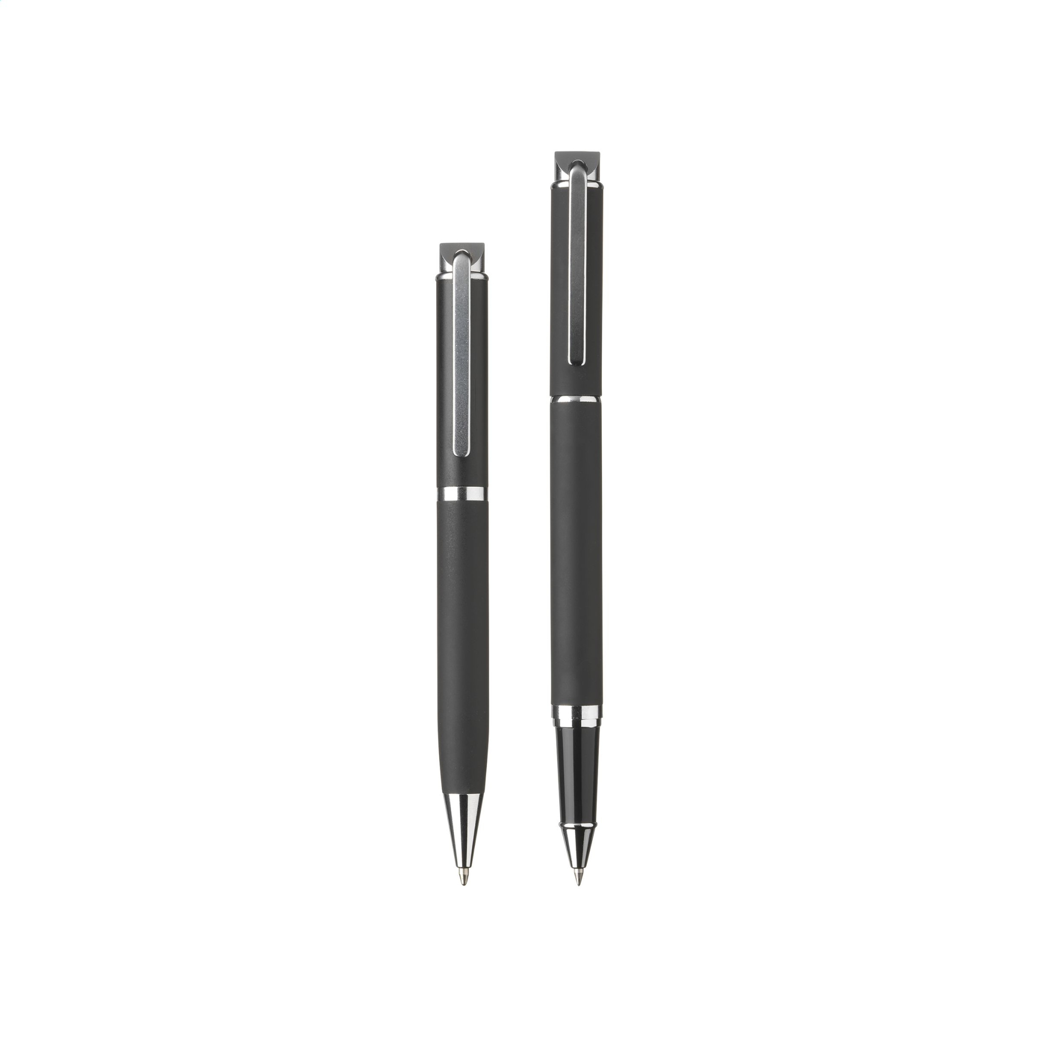 Metallinen kirjoitussetti: sininen mustekynä ja rullakynä. Molemmissa tyylikäs kumipinnoite, kauniisti muotoiltu toppi, jossa klipsi ja kiiltävät korostukset. Tuotteet toimitetaan sarjana, jokainen sarja erikseen pakattuna.