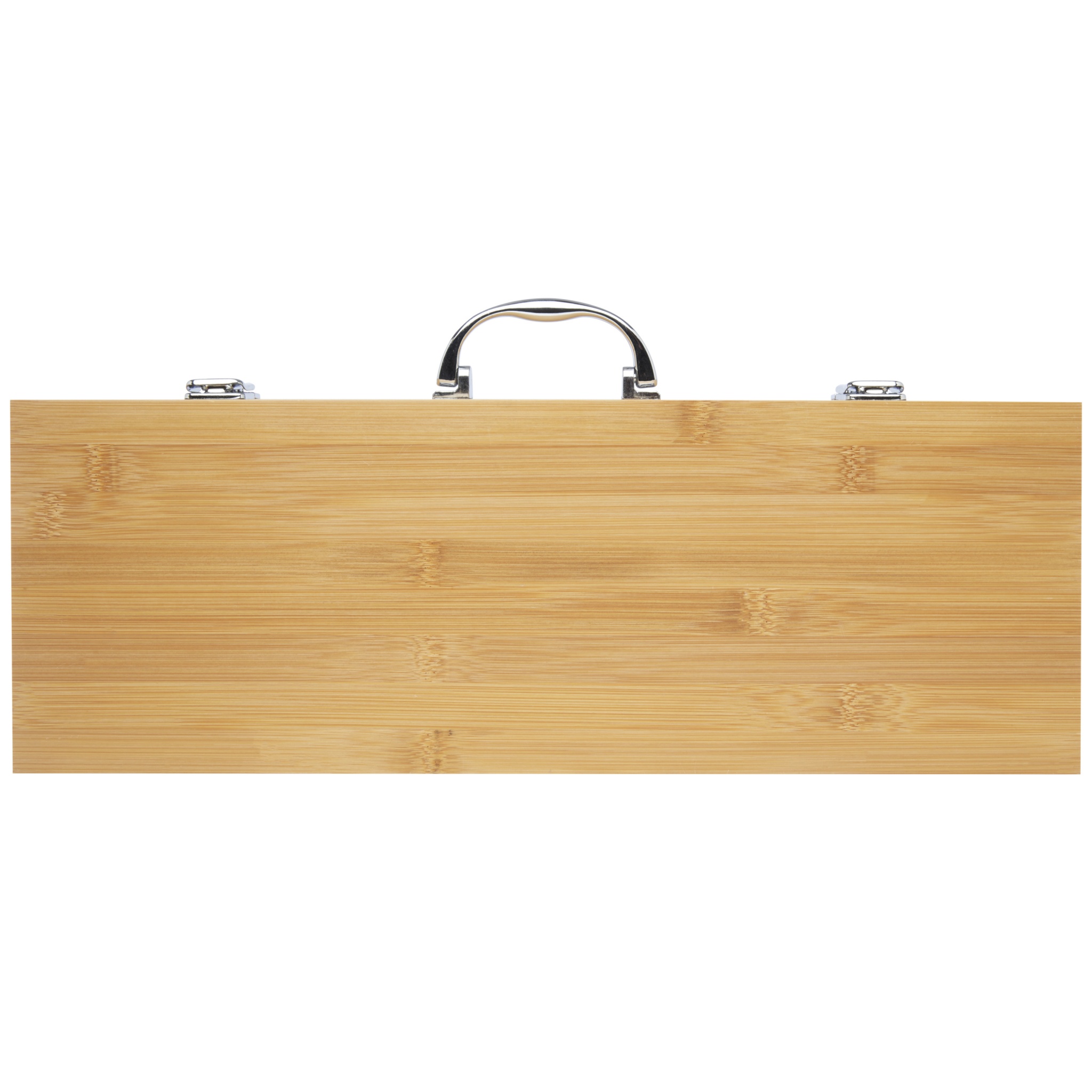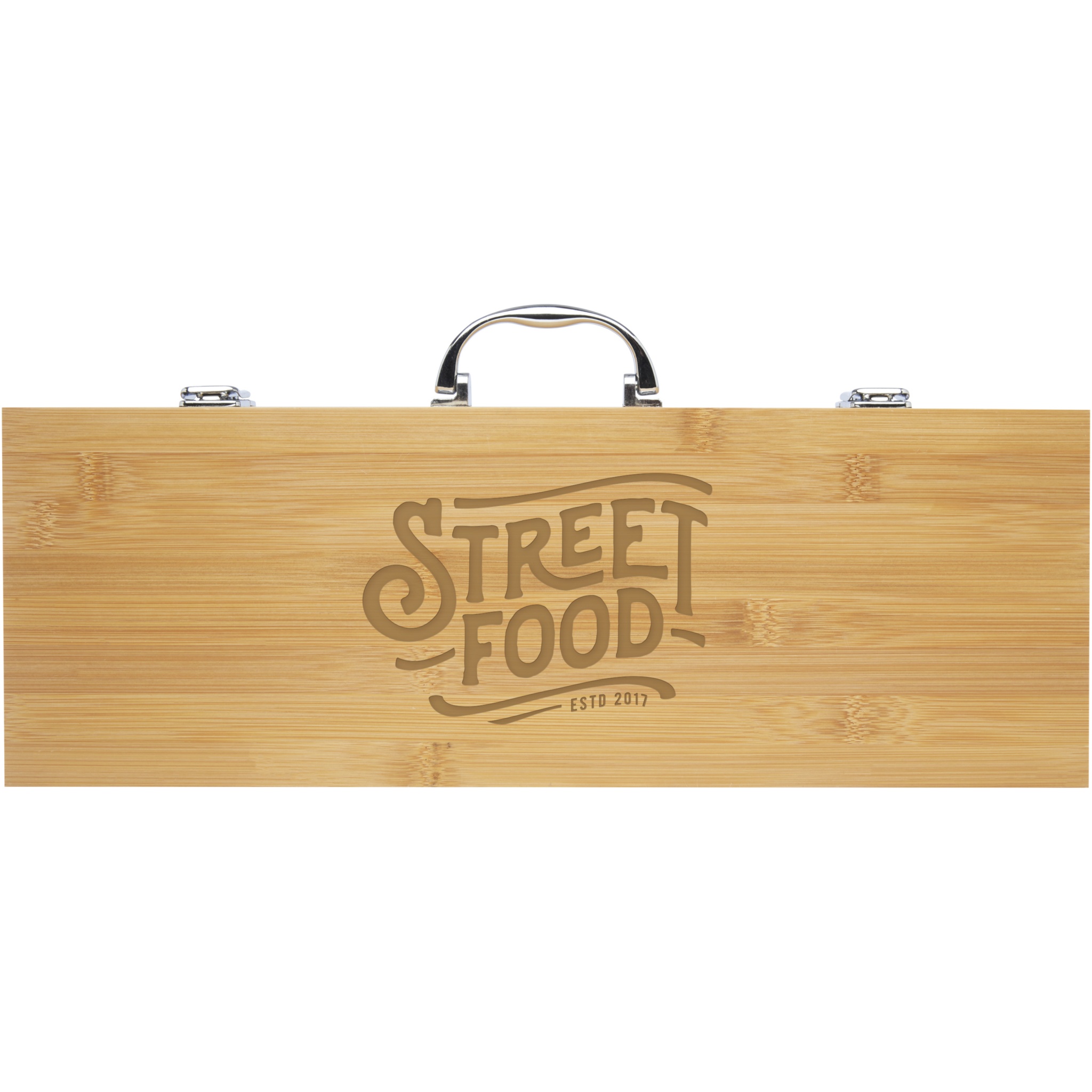 Bambusta valmistettu 5-osainen grillausvälinesetti, jossa on lasta (40 x 9,5 cm), pihdit (34,5 x 6 cm), haarukka (38,5 x 3 cm), veitsi (38,5 x 3 cm) ja harja (38 x 4,3 cm). Setti toimitetaan bambusta valmistetussa lahjapakkauksessa (46 x 16,2 x 7,4 cm). Kahvoissa ja lahjapakkauksessa käytetty bambu on hankittu ja valmistettu kestävien standardien mukaisesti.