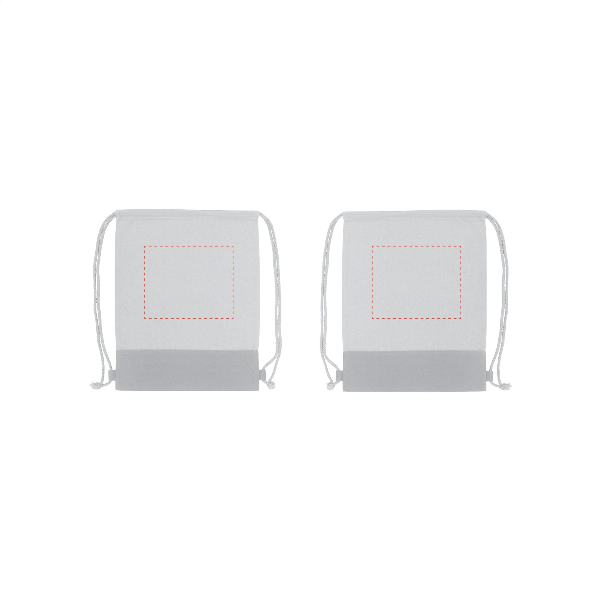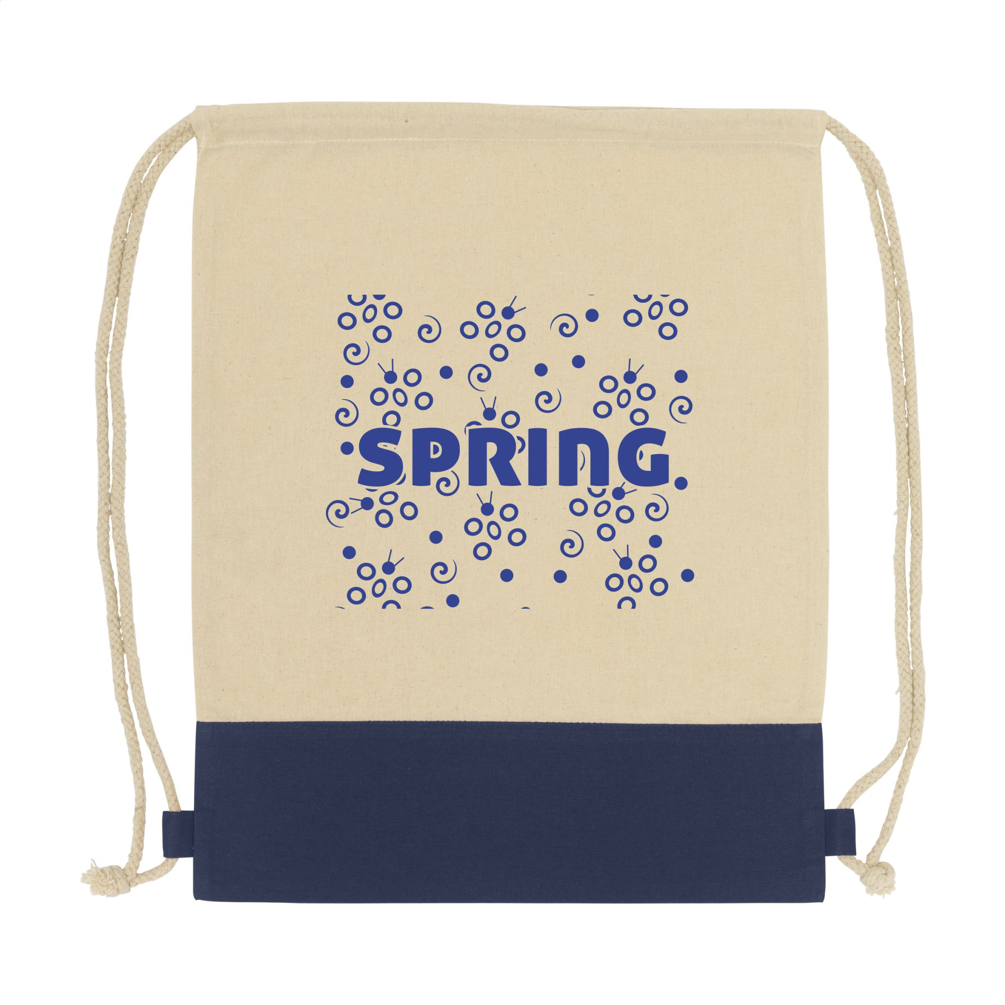 Reppu kiristysnyörillä 100 % puuvillaa (125 g/m²) ja värillinen upote. Kapasiteetti n. 8 litraa.