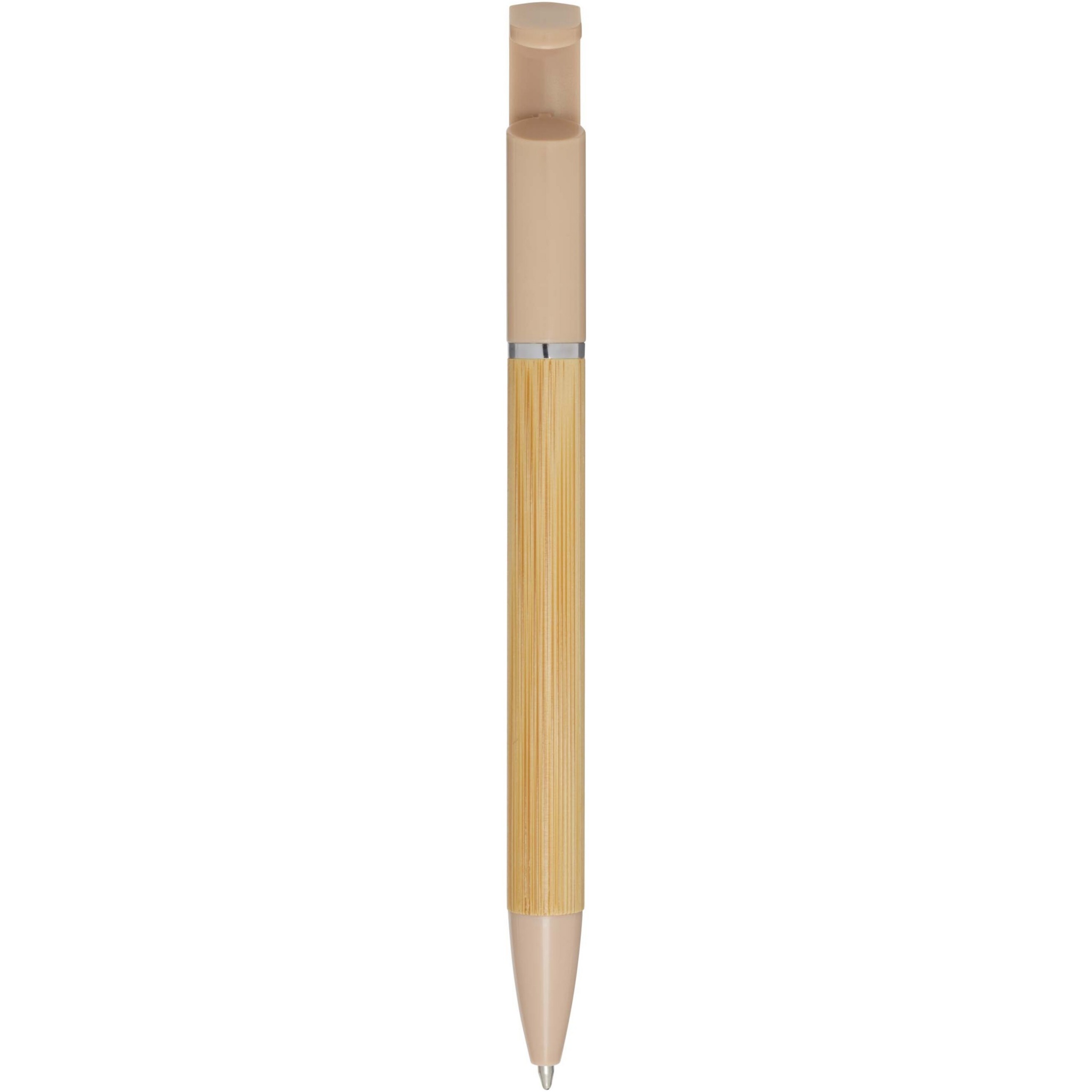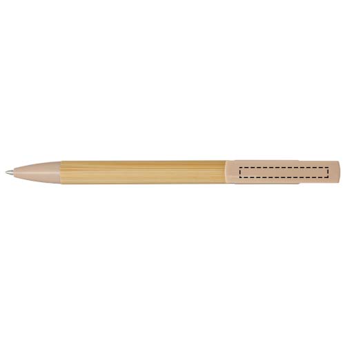 Bambukuulakärkikynä, jota voi käyttää myös puhelimen pidikkeenä. Painike ja keskiosan rengas on valmistettu kierrätetystä muovista, kärki messingistä ja runko vastuullisesti tuotetusta bambusta. Musteen väri: Sininen. Kirjoituspituus: 1000 metriä. Lyijyn paksuus: 1,0 mm.