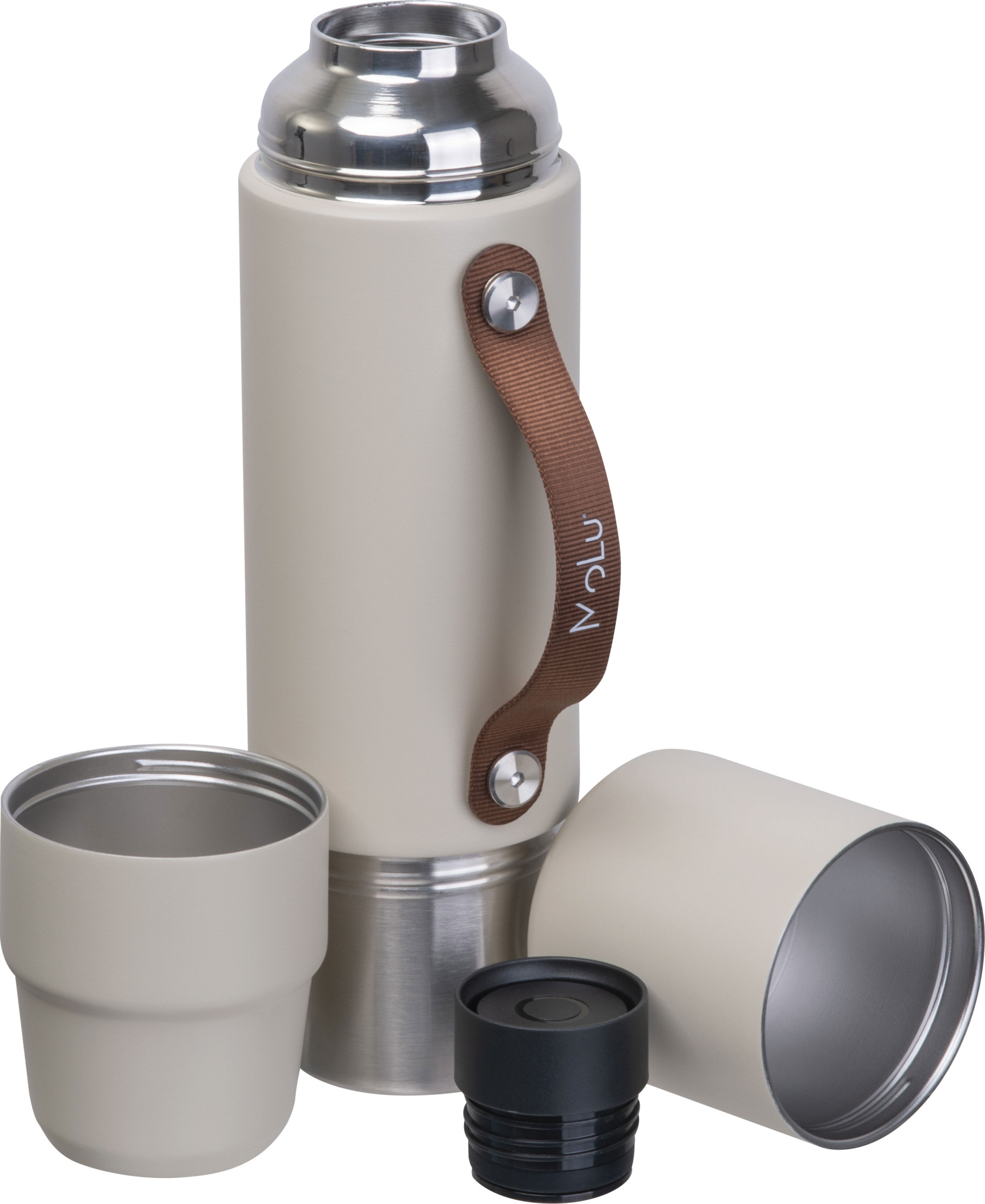 Valmistettu kierrätetystä ruostumattomasta teräksestä, kaksiseinäinen ja kuparieristetty – pitää juomat kuumina tai kylminä jopa 20 tuntia. Muotoiluun integroitu: kaksi kuppia – yksi kannessa, yksi pohjassa. Hienostunut ruskea kahva – ihanteellinen juomiseen, kaatamiseen tai kantamiseen. Huolellisesti suunniteltu, kestävä ja täydellinen mukaan otettavaksi – MoLu fiksuimmillaan.