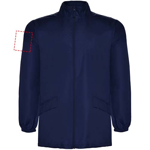 Vedenpitävä sadetakki. Korkea kaulus ja irrotettava huppu säädettävillä nauhoilla. Keskellä vetoketju ja saman sävyinen vedin. Kaksi sivutaskua suojaavilla listoilla. Joustavat hihansuut. Joustava nauha tasku sisäpuolella viikkaamista ja säilytystä varten. Kuvan malli on 185 cm pitkä ja hänellä on päällään koko L.