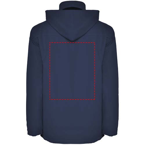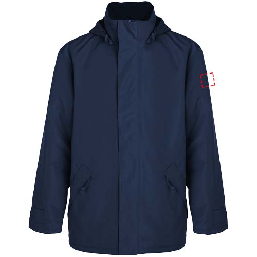 Vedenpitävä topattu parkatakki. Keskellä vetoketju saman sävyisellä suojaavalla listalla. Korkea kaulus ja taitettu, irrotettava huppu Sivutaskut vetoketjuilla ja suojaavilla listoilla. Tarroilla säädettävät hihansuut. Sisäpuolella kaksi rintataskua tarrakiinnityksellä. Sisäpuolella aukko painatusta tai brodeerausta varten. Vedenpitävä. Tuulenpitävä. Kuvan mallit ovat on 120/122 cm pitkiä ja heillä on päällään koko 6.
