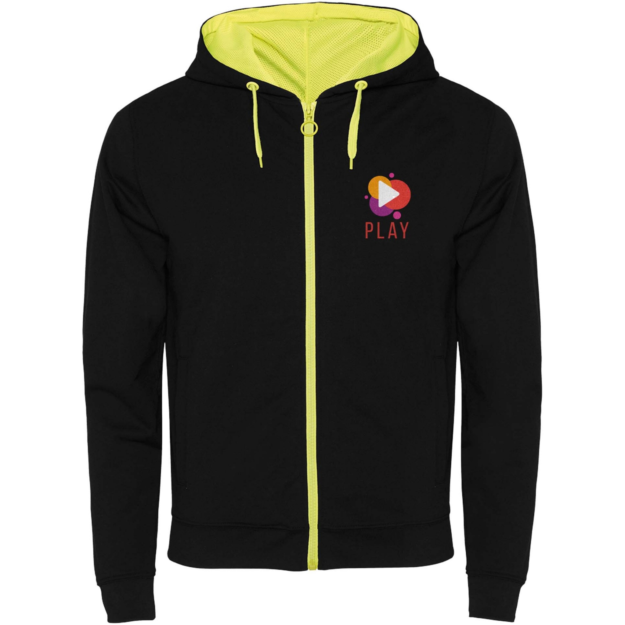 Verryttelytakki harjaamattomasta fleecestä kirkkaanvärisillä koristeluilla. Keskellä vetoketju kontrastivärisellä vetimellä. Hupussa kirkkaan kontrastivärinen vuori mikroperforoidusta polyesterikankaasta. Kiristysnyöri ja kirkkaan kontrastiväriset metalliset lenkit. 1x1-resori hihansuissa ja vyötäröllä. Kaksi etutaskua leveällä reunuksella. Kauluksen sisäpuolella vahvistetut koristesaumat. Irrotettava etiketti.