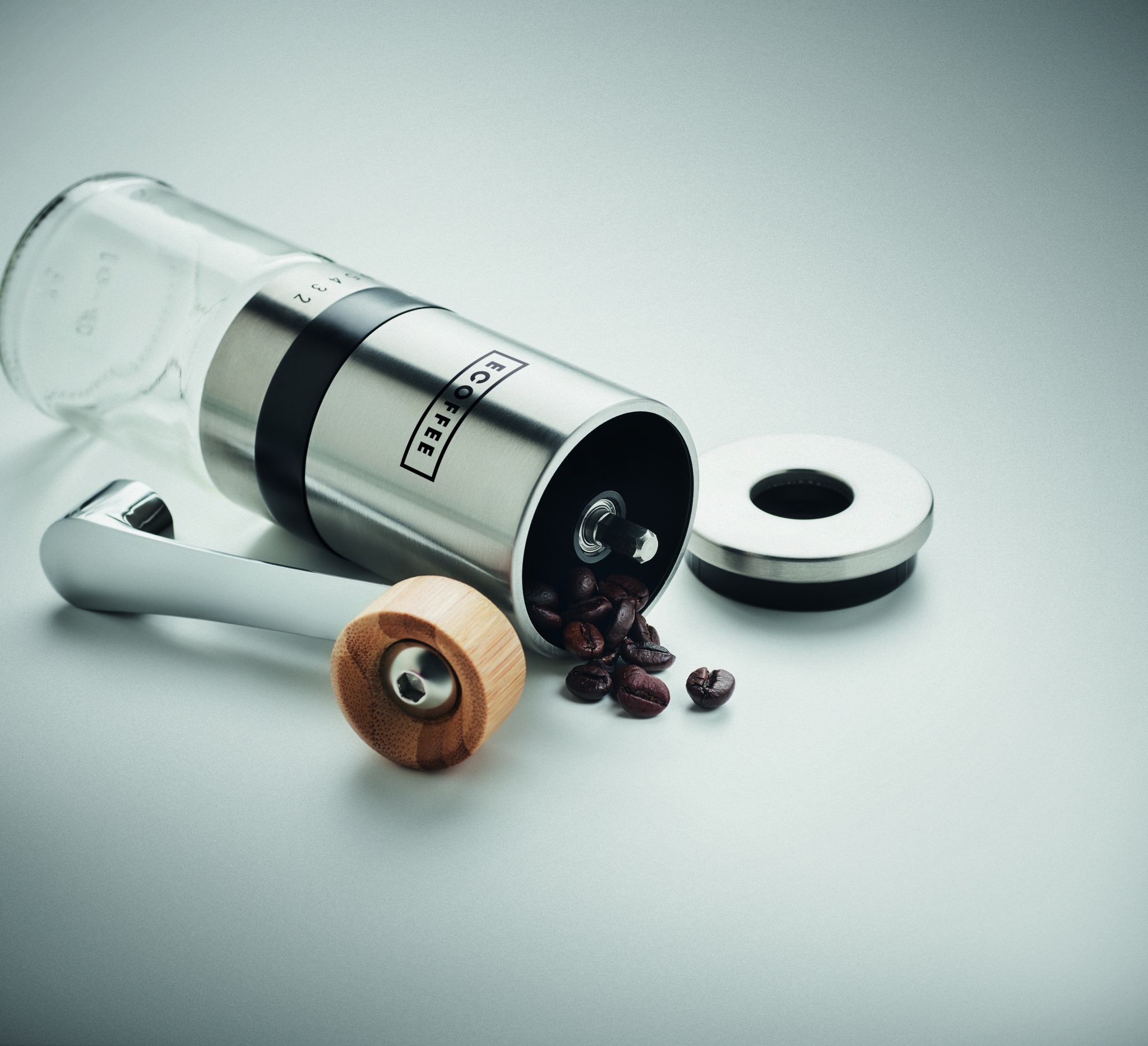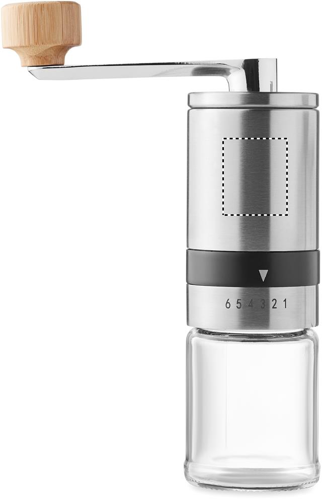 Kahvisetti, sisältää lasisen ruostumattomasta teräksestä valmistetun 350 ml kahvinkeittimen ja manuaalisen keraamisen 100 ml kahvimyllyn.
